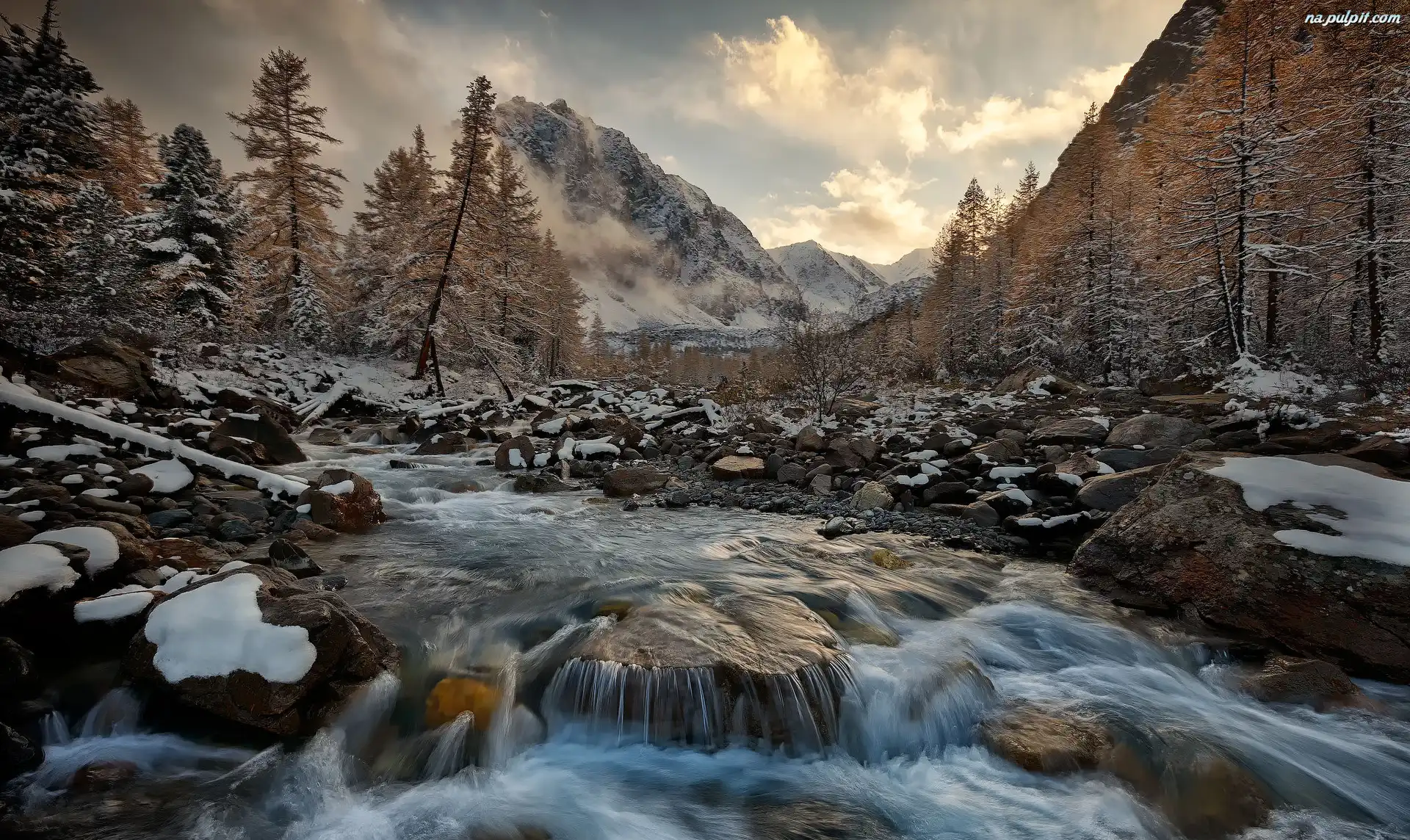 Drzewa, Kamienie, Góry, Zima, Rzeka Na Pulpit