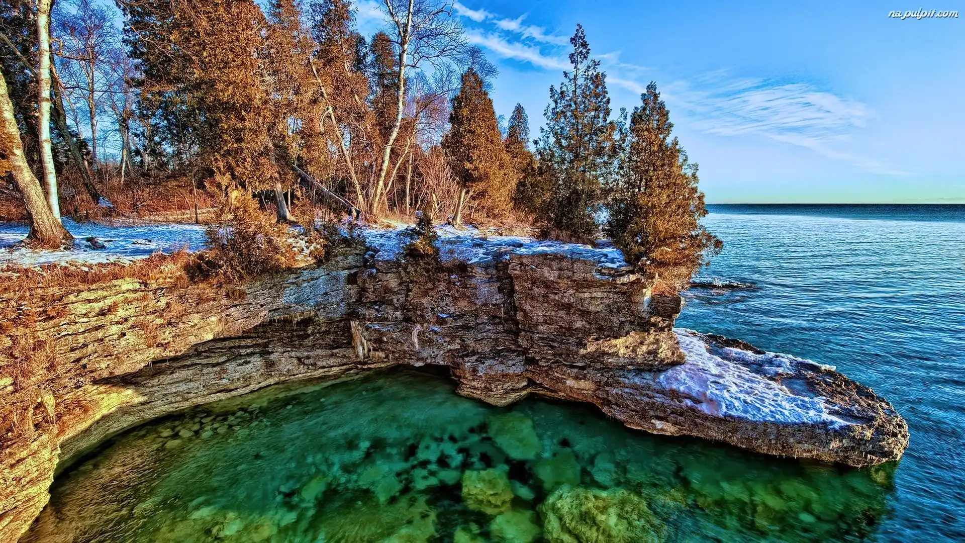 Drzewa, Morze, Zima, Skały Na Pulpit