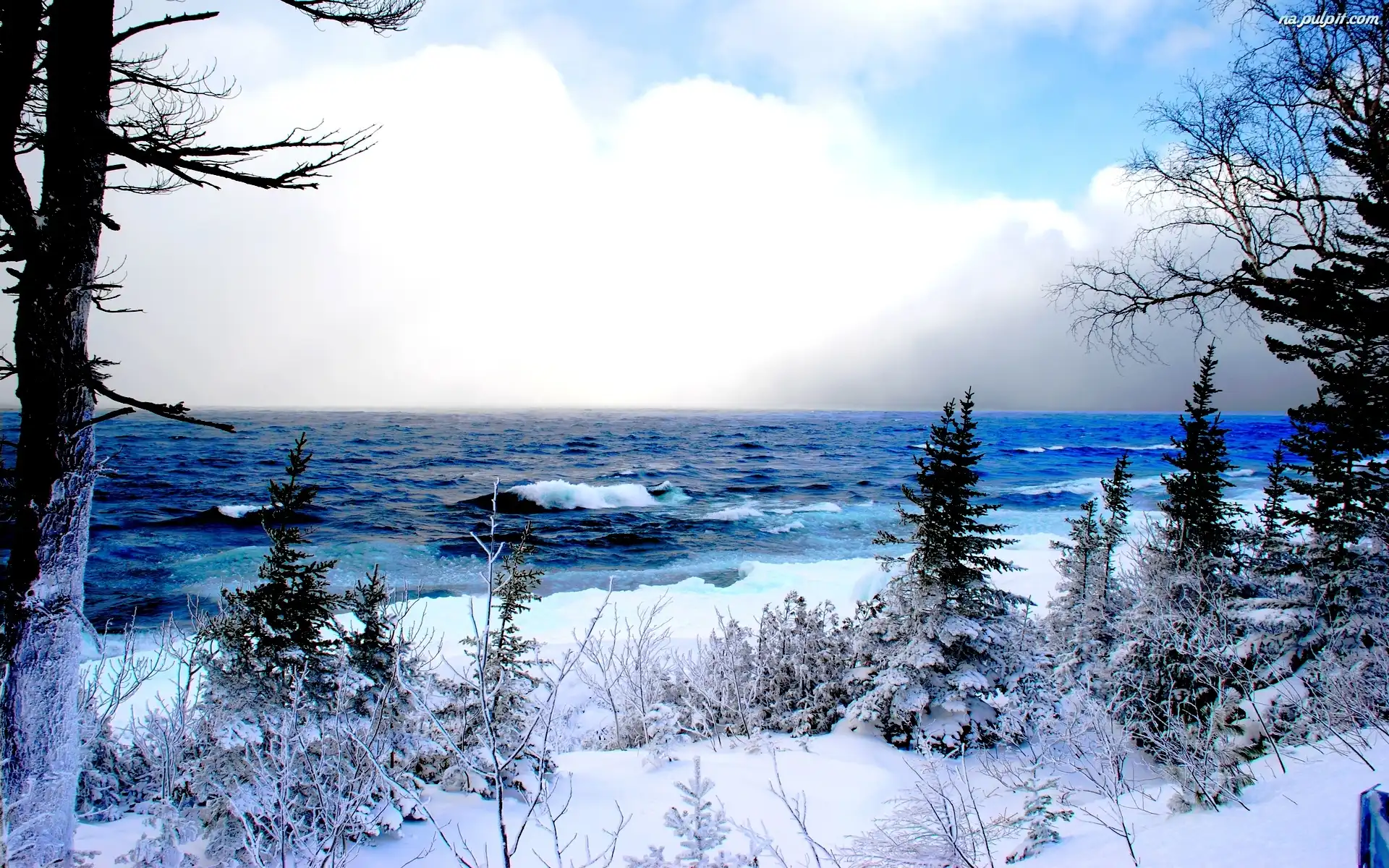 Drzewa, Åšnieg, Zima, Morze Na Pulpit