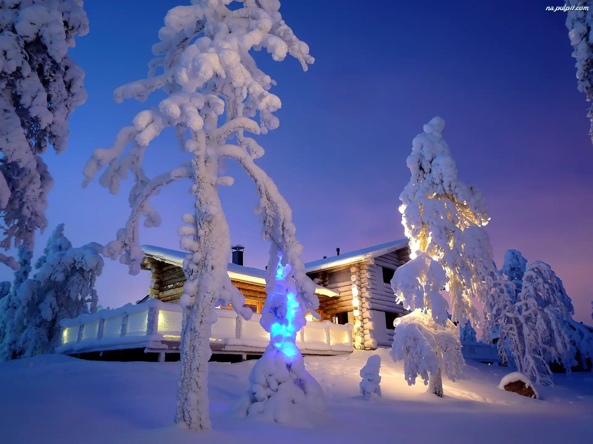 Drzewa, Domek, Oświetlony, Zima, Ośnieżone Na Pulpit