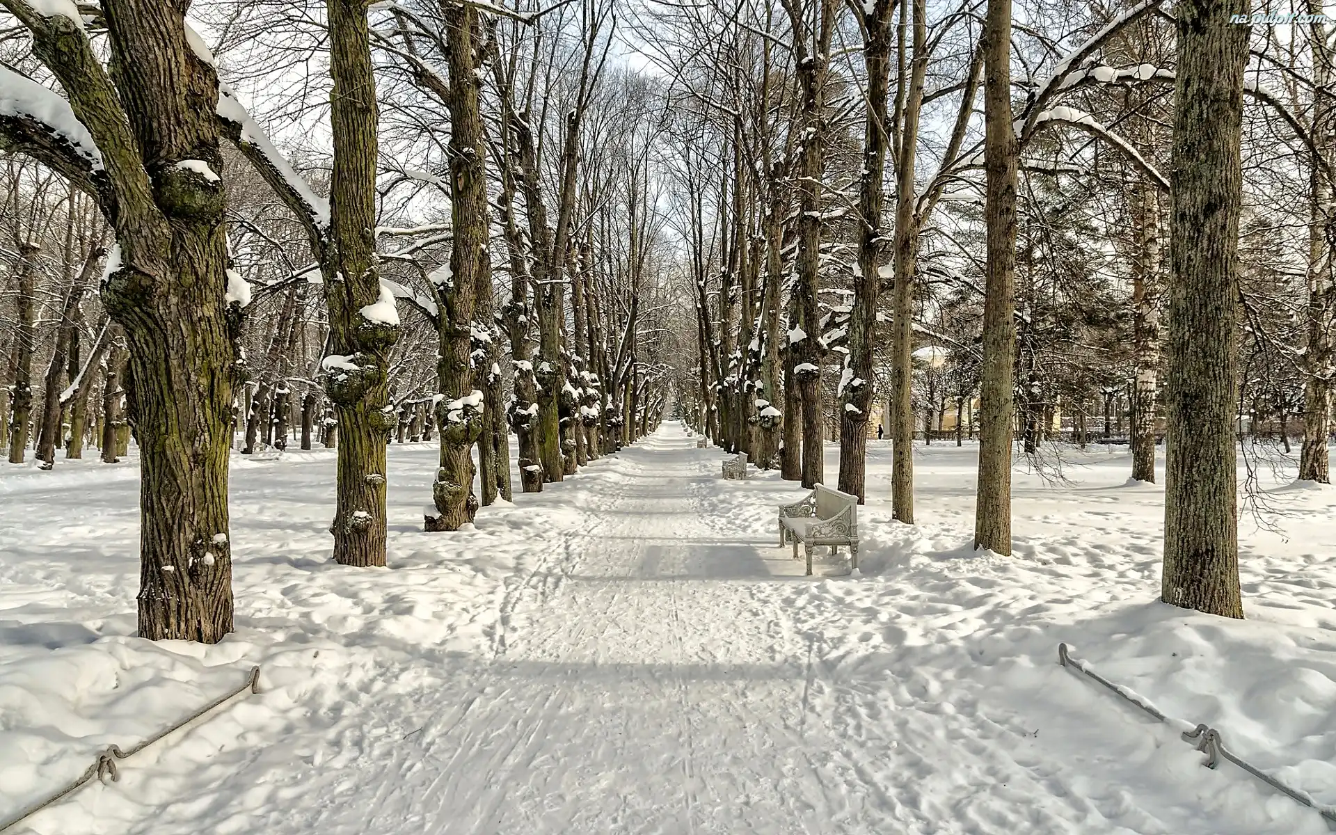 Drzewa, Droga, Park, Zima, Ławki Na Pulpit
