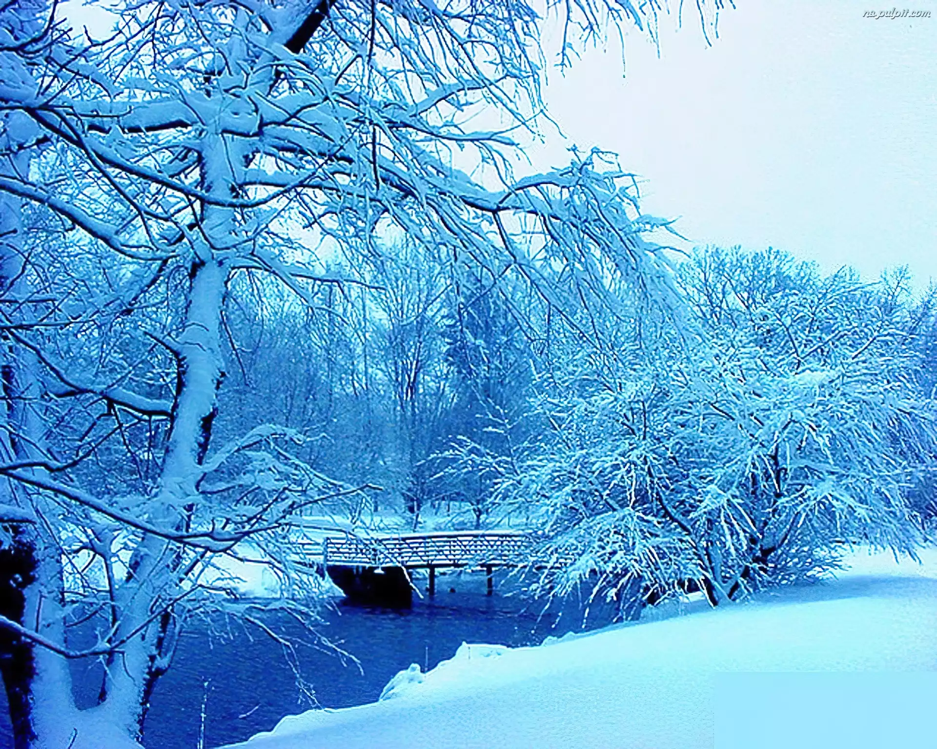 Drzewa, Mostek, Rzeka, Zima, Ośnieżone Na Pulpit