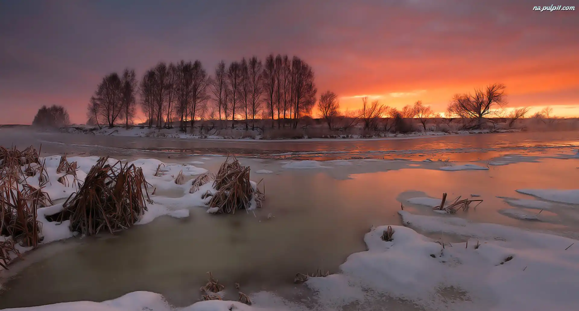 Drzewa, Zachód, Rzeka, Zima, Słońca Na Pulpit