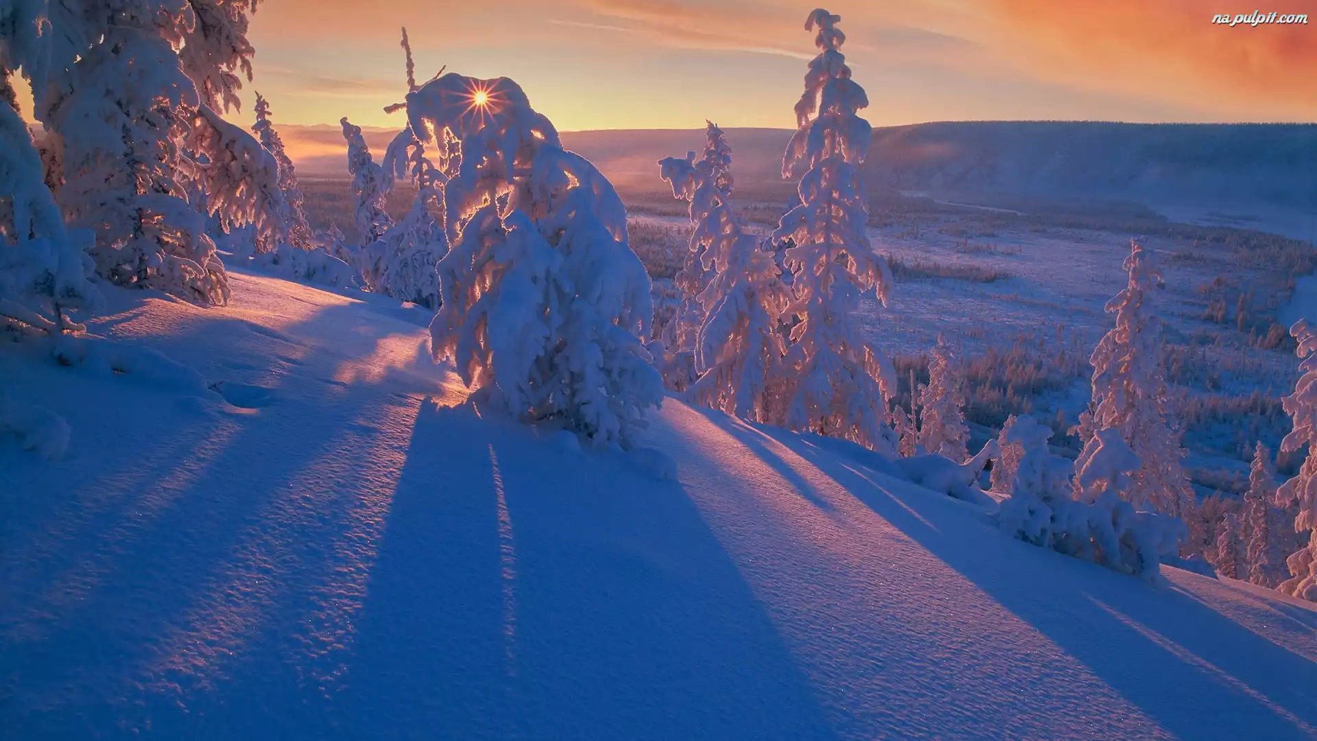 Promienie słońca, Zima, Drzewa, Ośnieżone, Wzgórze, Góry Na Pulpit