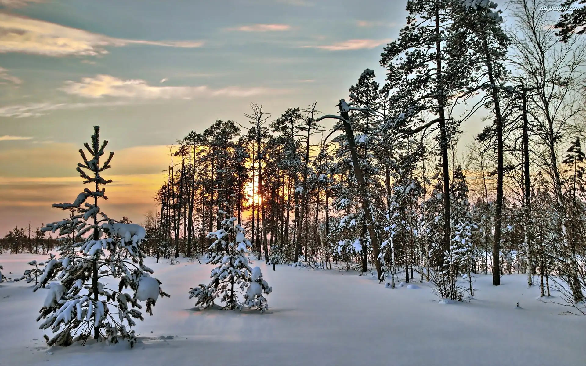 Drzewa, Zachód Słońca, Śnieg, Zima, Las Na Pulpit