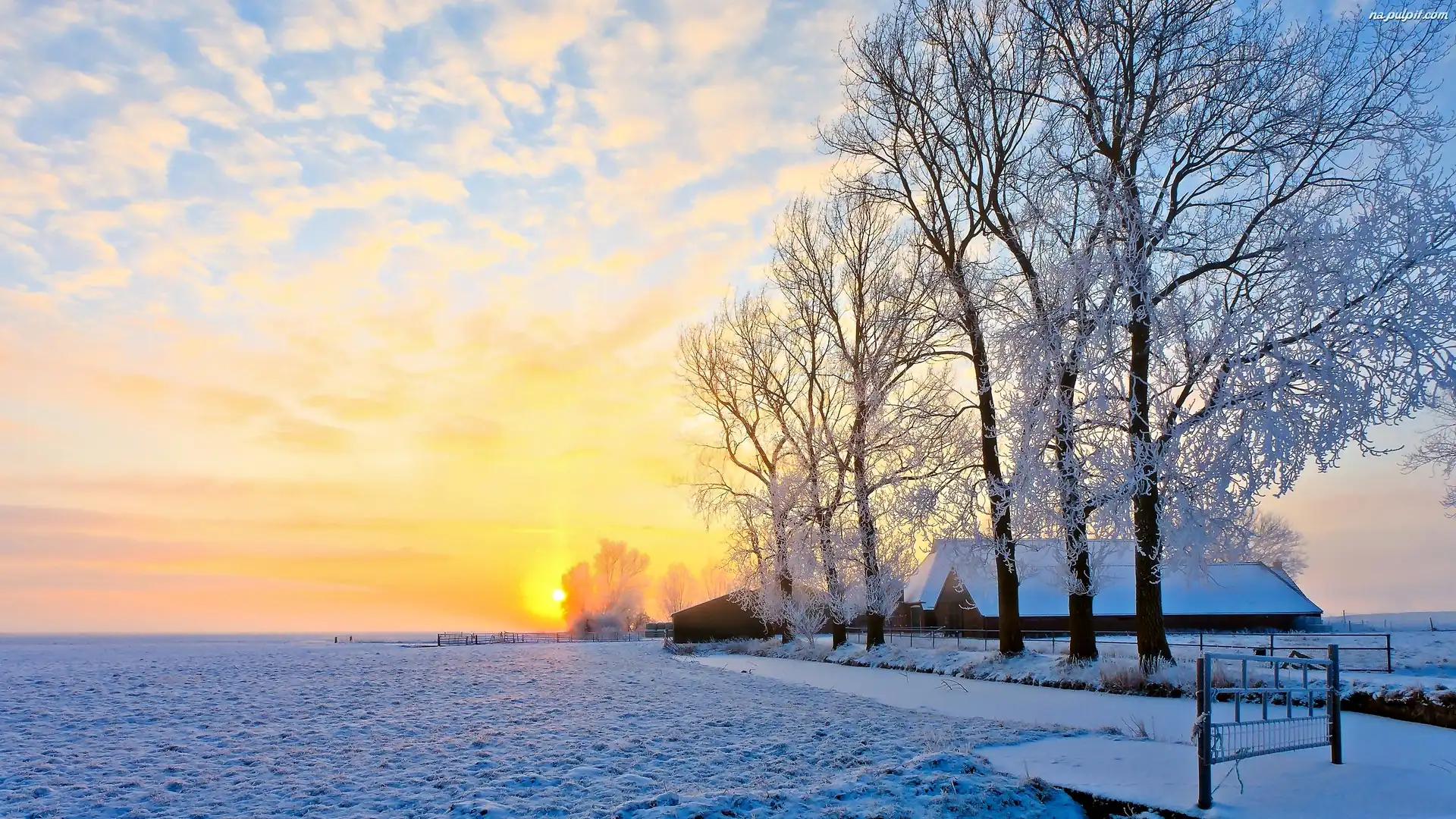 Drzewa, Wschód słońca, Zima, Pole Na Pulpit