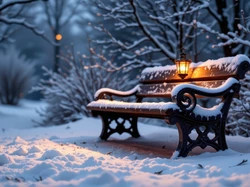 Drzewa, Krzewy, Noc, Ośnieżona, Ławka, Śnieg, Zima, Ośnieżone, Lampion