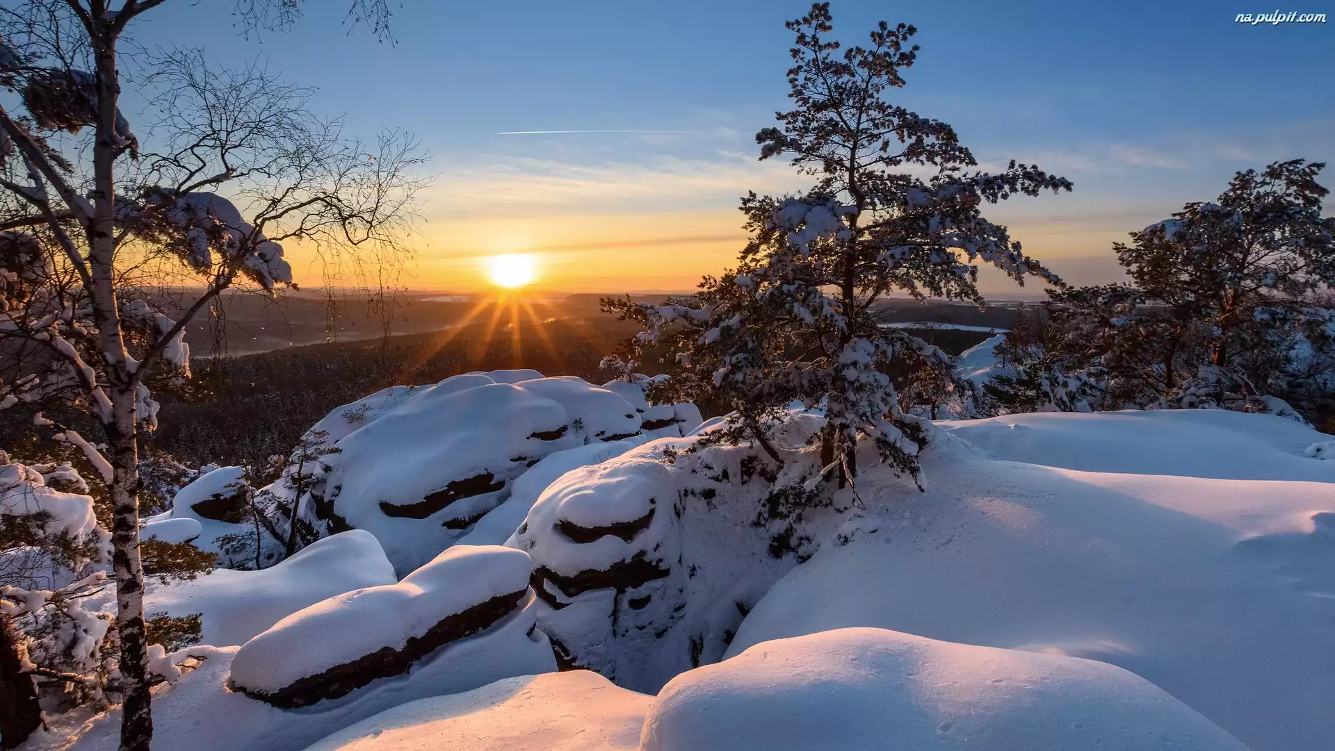 Drzewa, Góry, Zachód słońca, Zima, Śnieg Na Pulpit