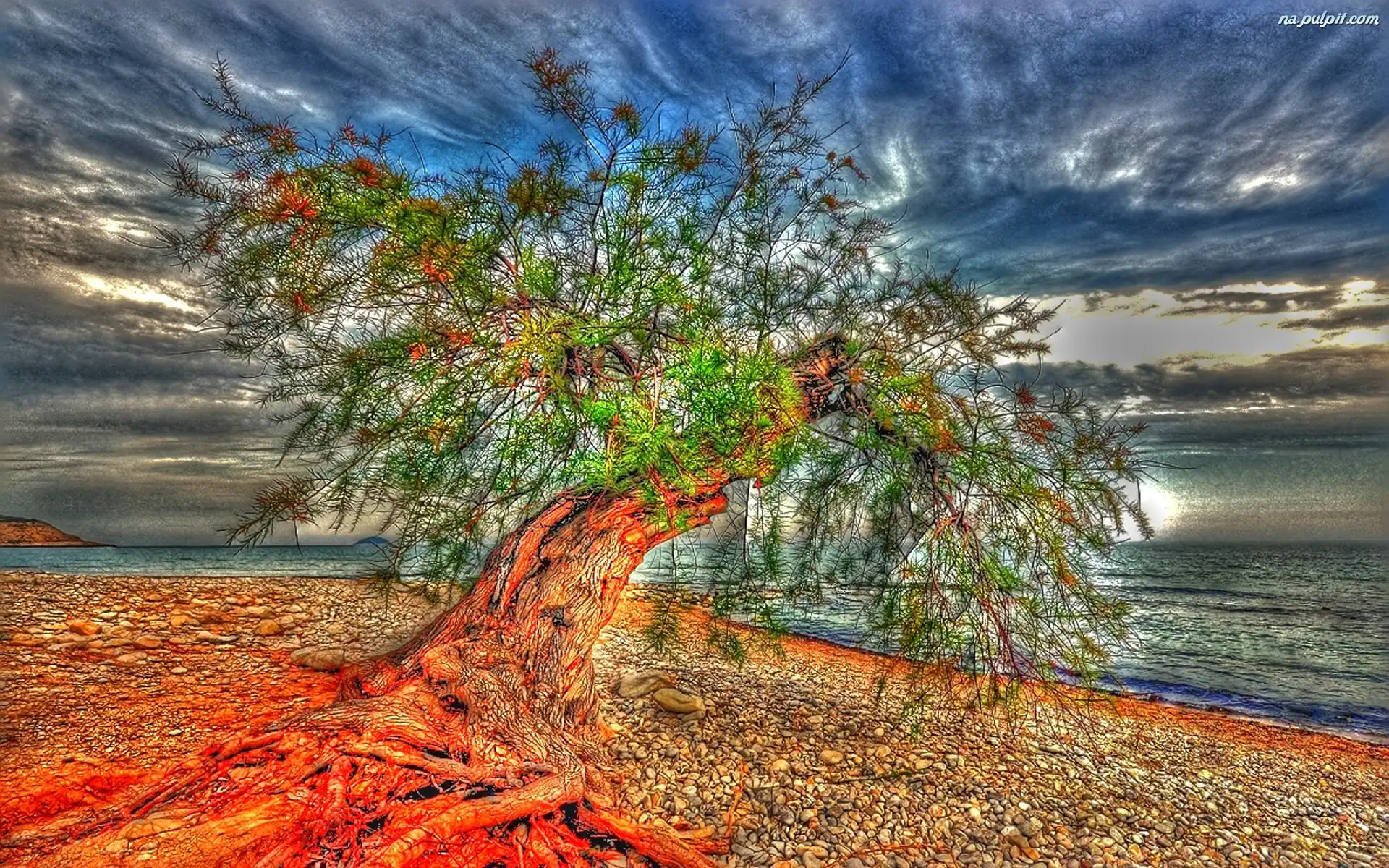 Drzewo, Kamienista, Morze, Chmury, Plaża Na Pulpit
