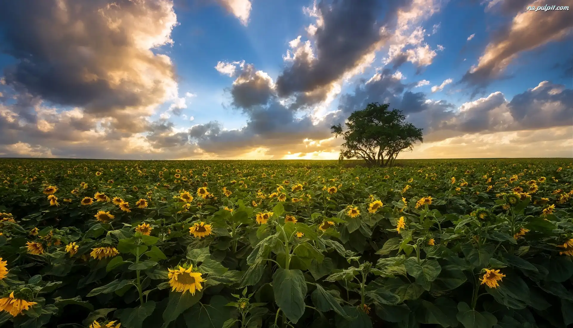 Drzewo, Kwiaty, Pole, Chmury, Słoneczniki Na Pulpit