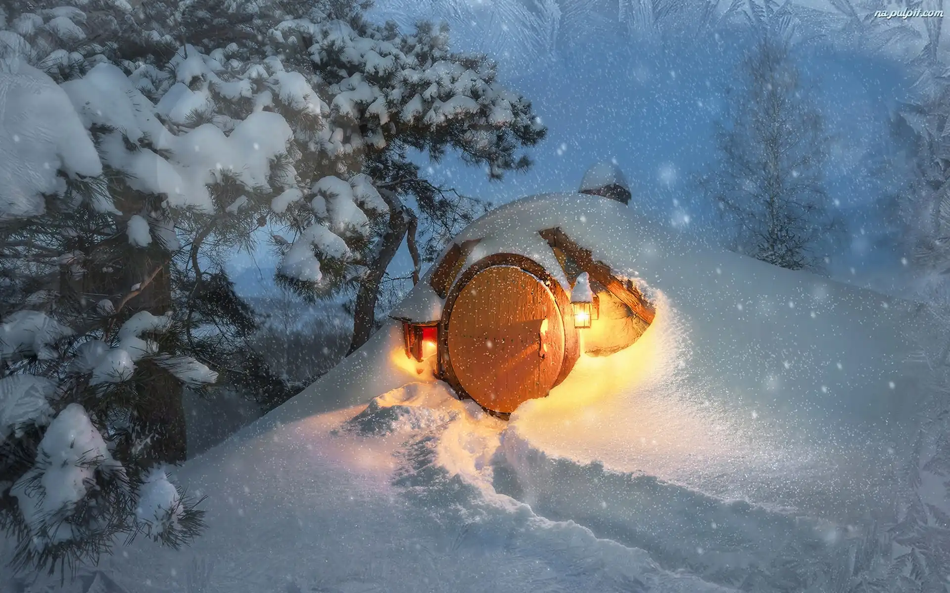 Hobbita, Drzewo, Śnieg, Drzwi, Ścieżka, Oświetlony, Zima, Domek Na Pulpit