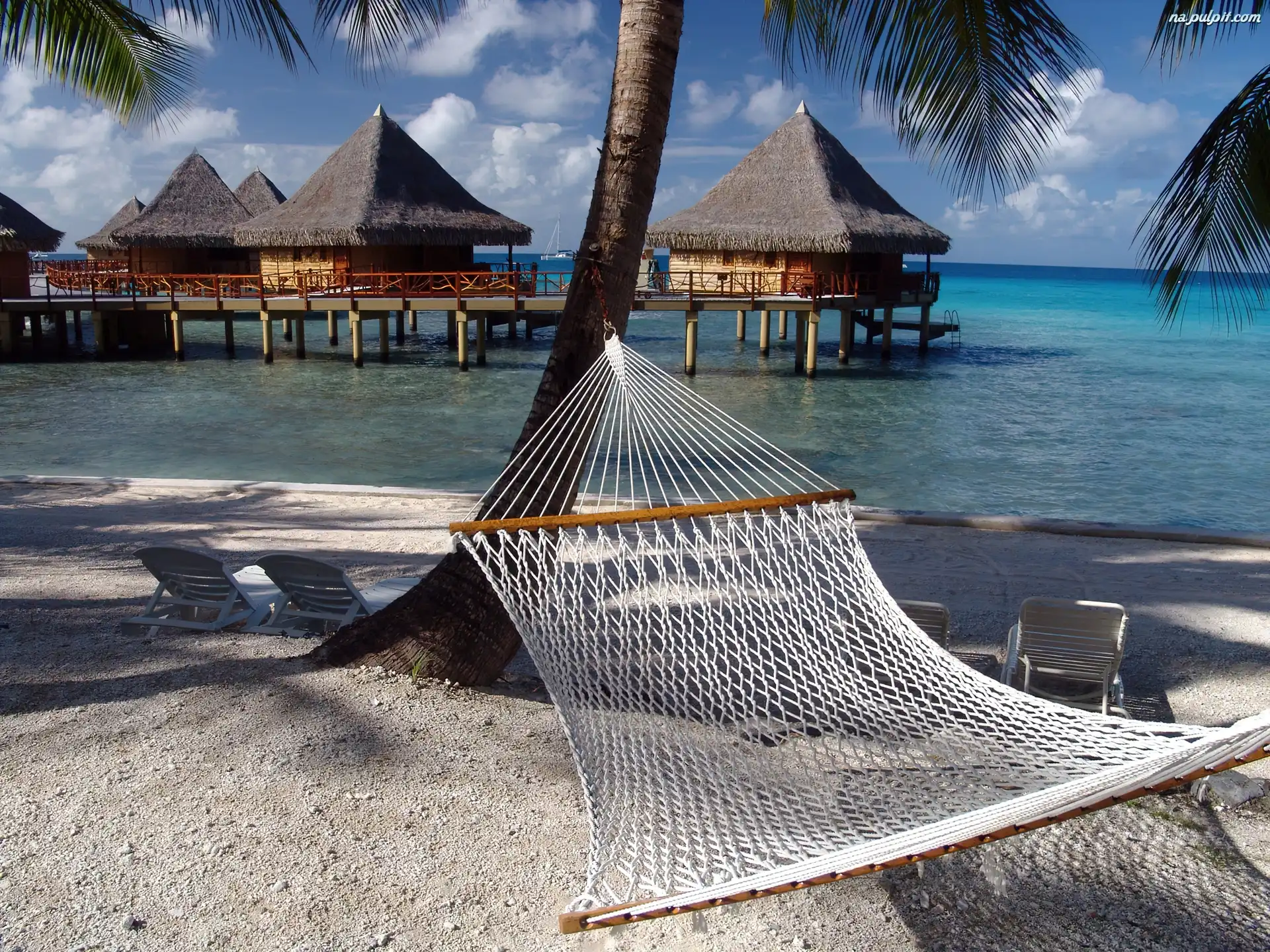 Drzewo, Piasek, Woda, Domki, Hamak Na Pulpit