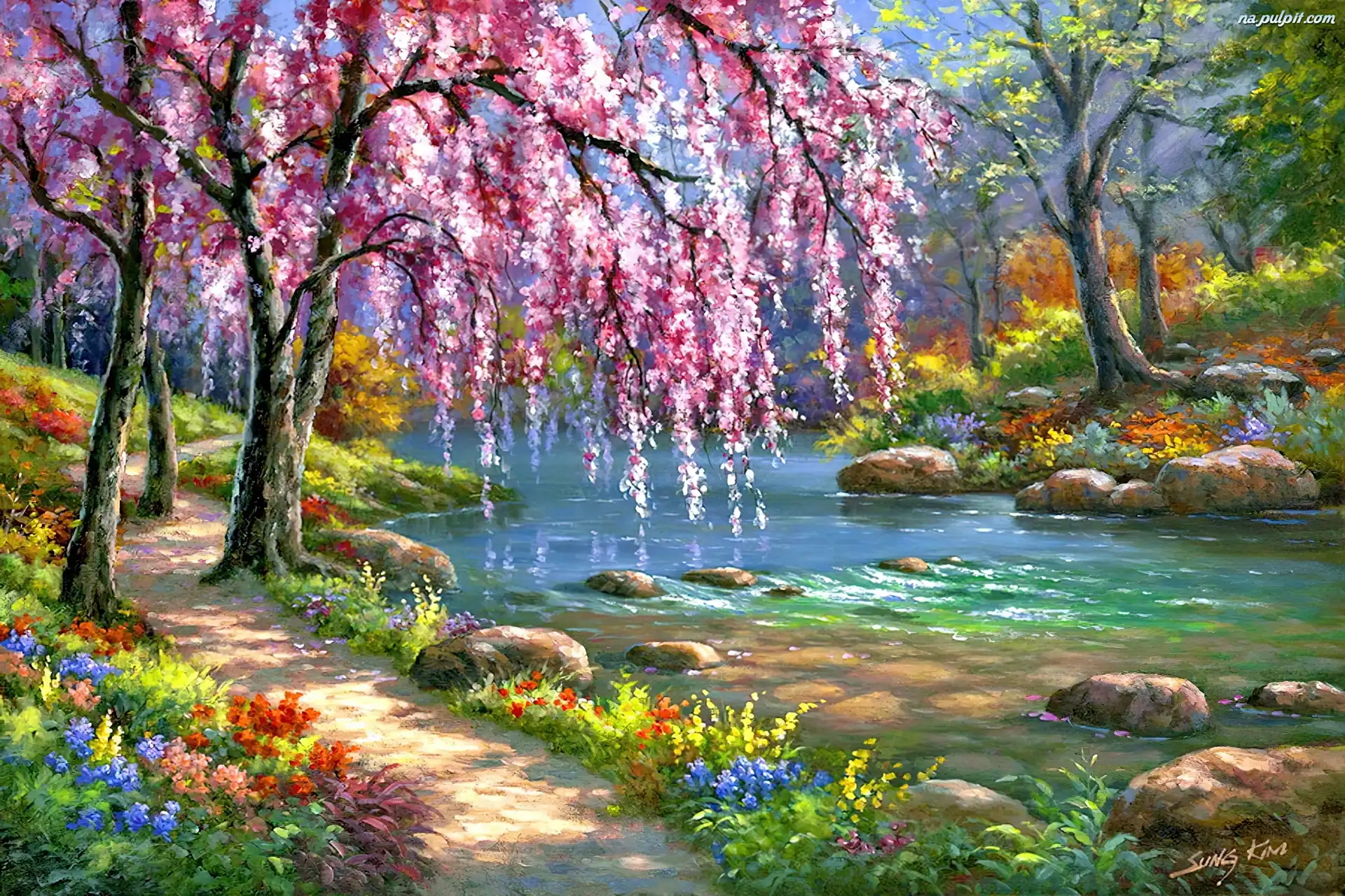 Drzewo, Kwiaty, Rzeka, Dróżka, Kwitnące Na Pulpit