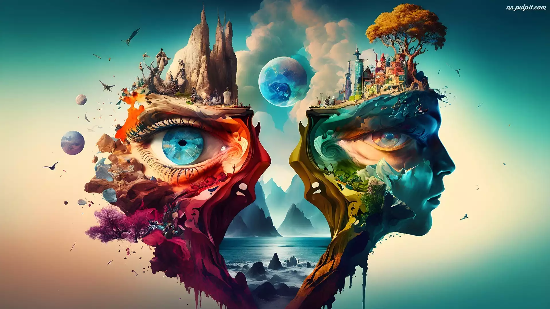 Drzewo, Surrealizm, Głowy, Twarz, Góry, Oczy, Fantasy, Księżyc, Domy Na Pulpit