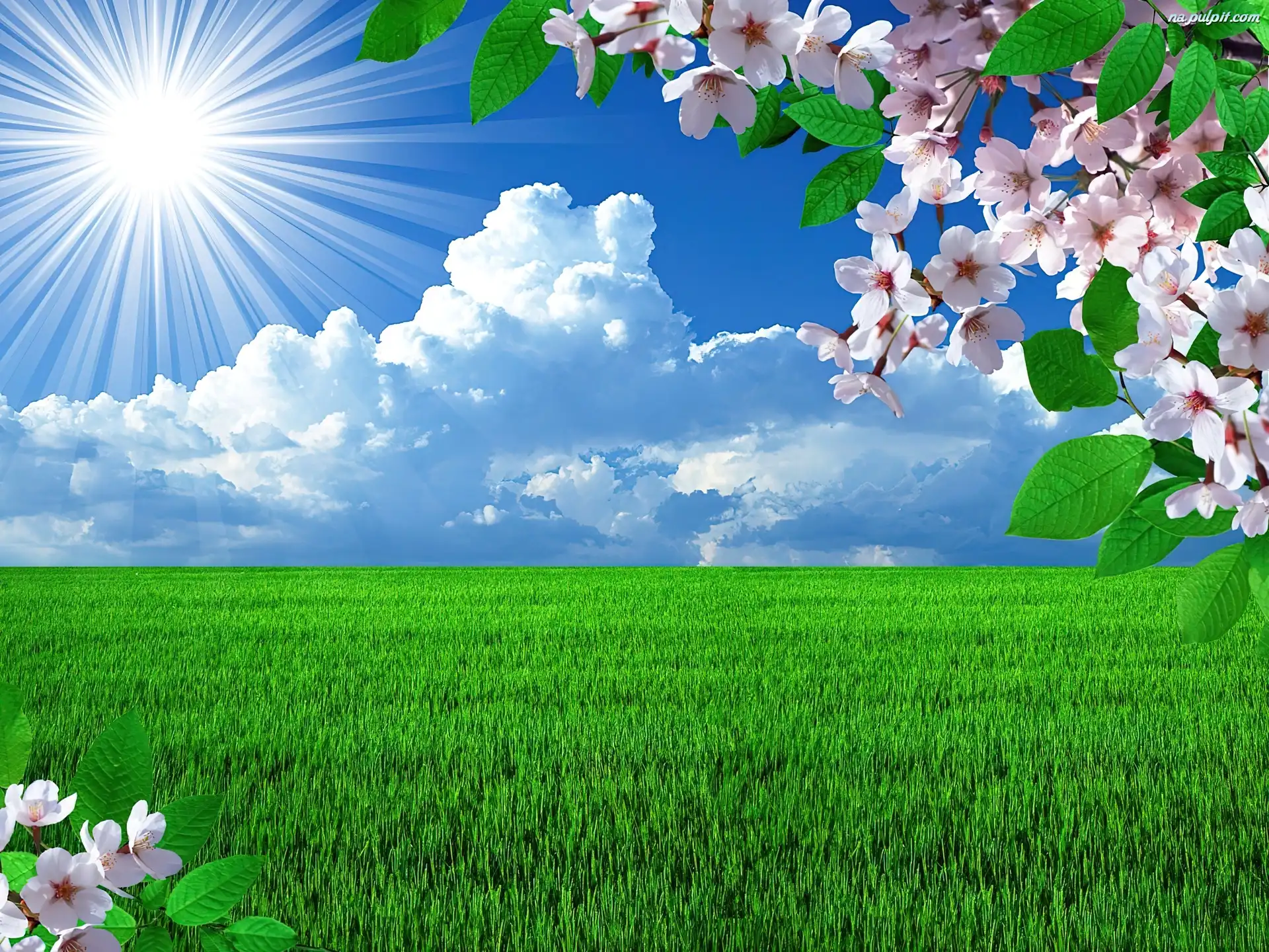 Grafika, Drzewo, Pole, Chmury, Słońce, Kwitnące, Zielone Na Pulpit