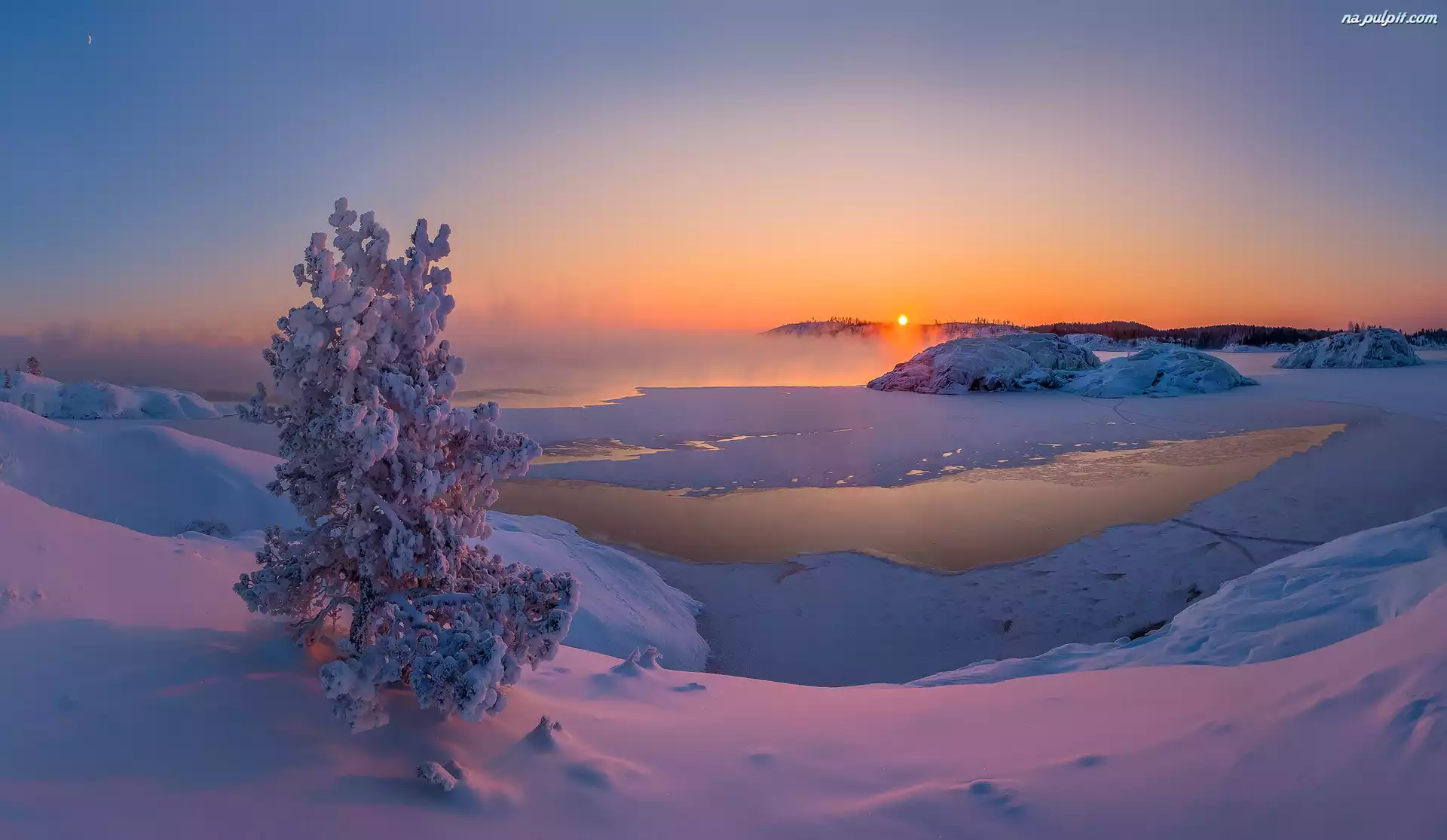 Jezioro, Drzewo, Zachód słońca, Mgła, Zima, Ośnieżone Na Pulpit
