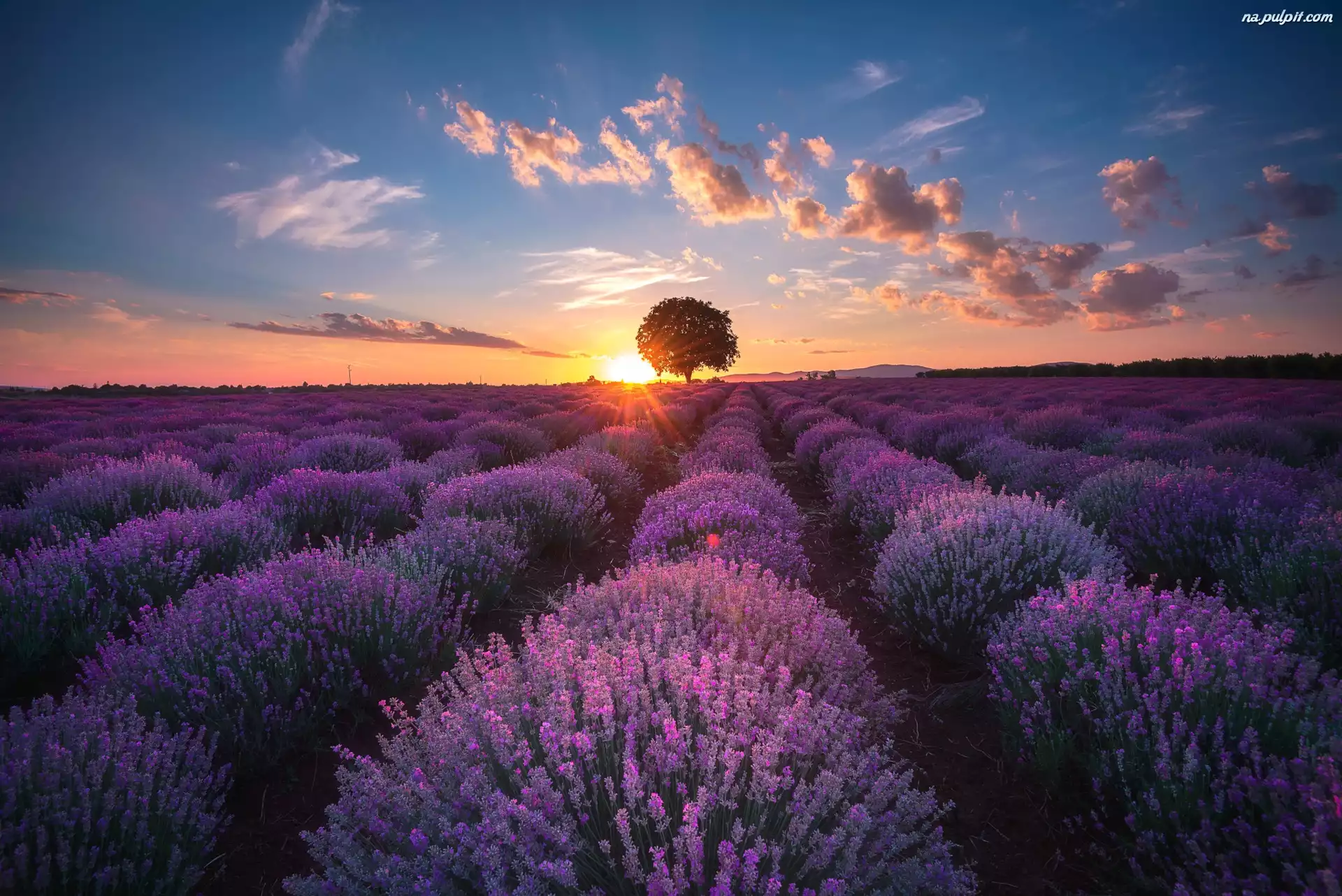 Chmury, Pole, Lawenda, Drzewo, Kwiaty, Zachód słońca Na Pulpit