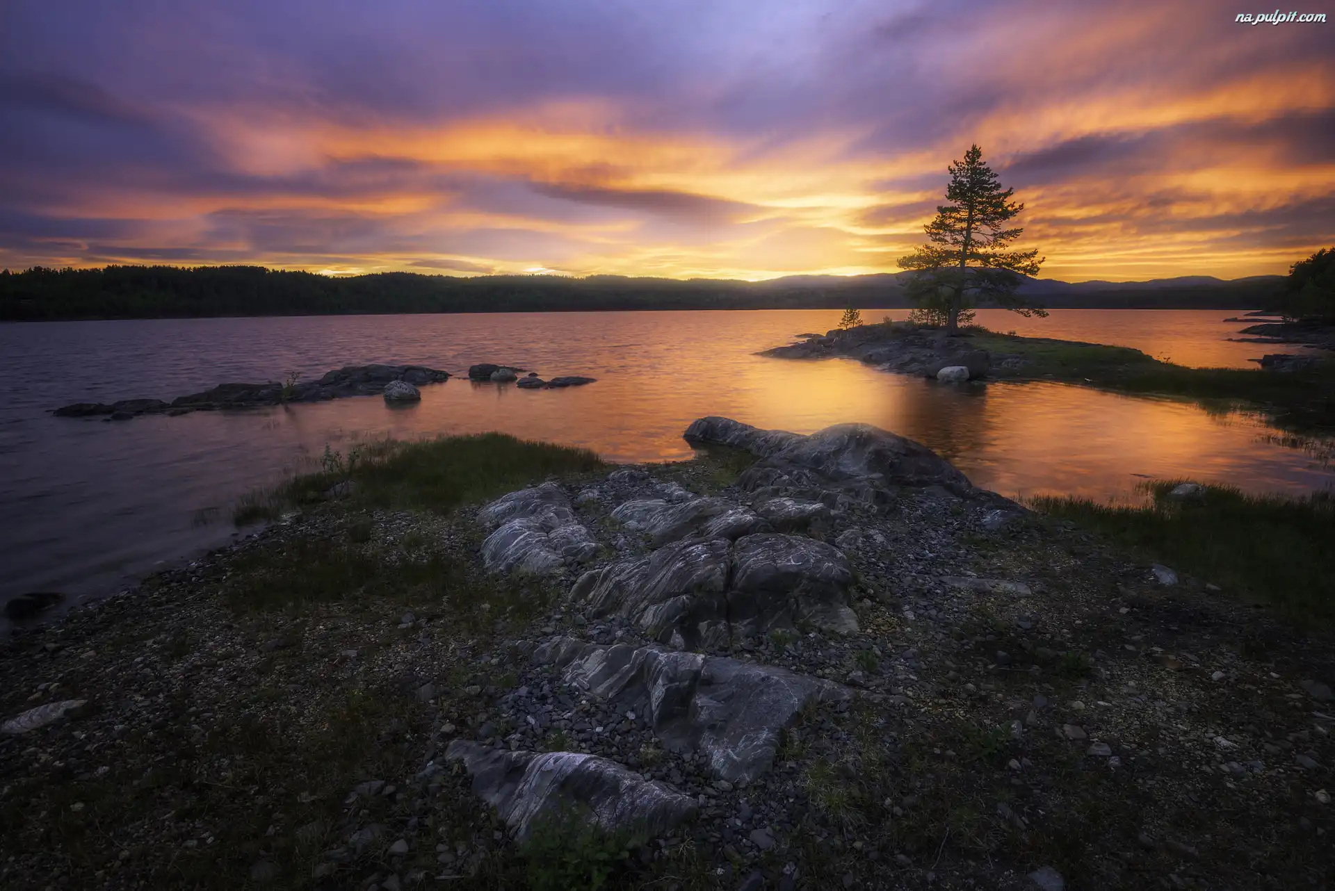 Drzewo, Zachód słońca, Jezioro, Norwegia, Skały