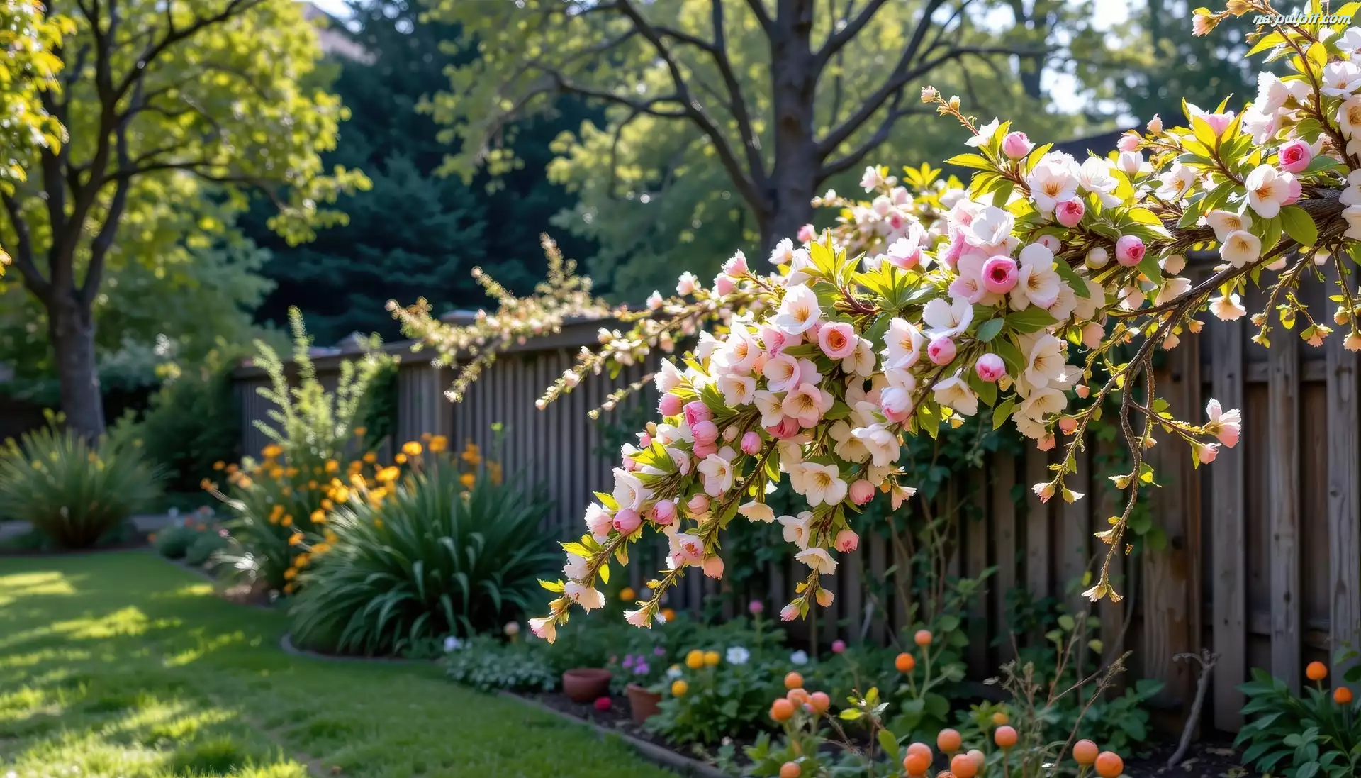 Ogród, Drzewo owocowe, Kwiaty, Płot Na Pulpit