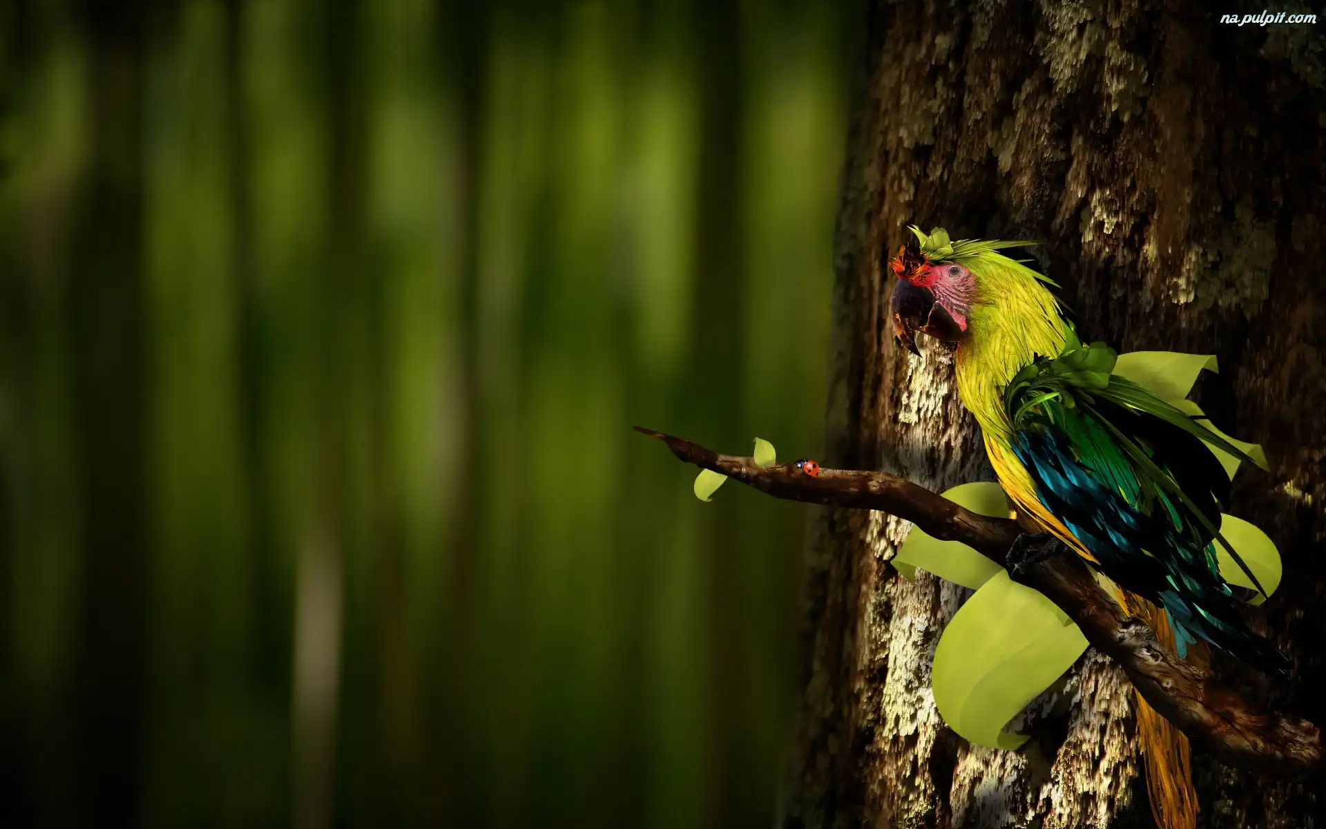 Papużki, Dwie, Zielone Papuga Drzewo, Jesień Papuga Drzewa, Jesień, Las Palma, Słońca, Zachód, Jacht Most, Palmy, Rzeka Wodospad Drzewa Trzy Drzewa 4D, Kolorowa, Papuga Papuga, Drzewo Kolorowa, Papuga Morze, Drzewo, Skała Dwie, Papugi