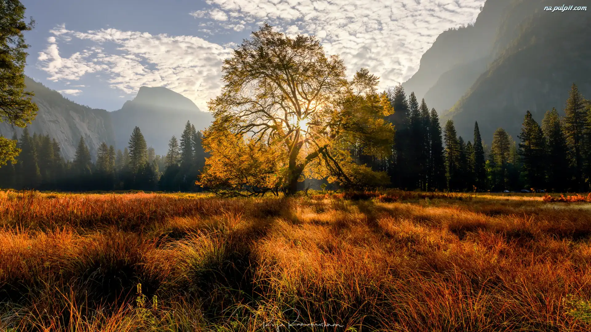 Drzewo, Wiąz, Park Narodowy Yosemite, Dolina, Drzewa, Las, Jesień, Kalifornia, Stany Zjednoczone, Trawa, Góry, Promienie słońca Na Pulpit |