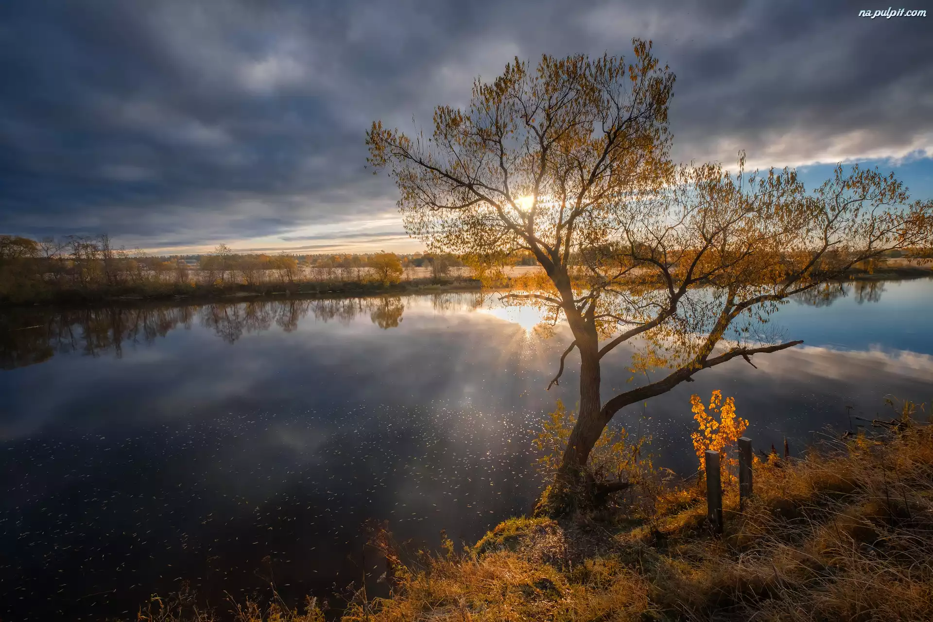 Chmury, Rzeka Dubna, Zachód słońca, Łatgalia, Łotwa, Odbicie, Jesień, Drzewo Na Pulpit