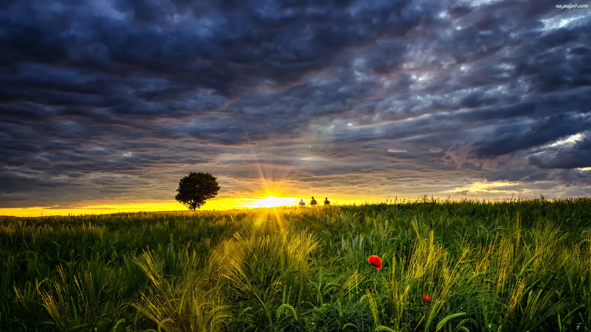 Drzewo, Chmury, Łąka, Wschód słońca Na Pulpit