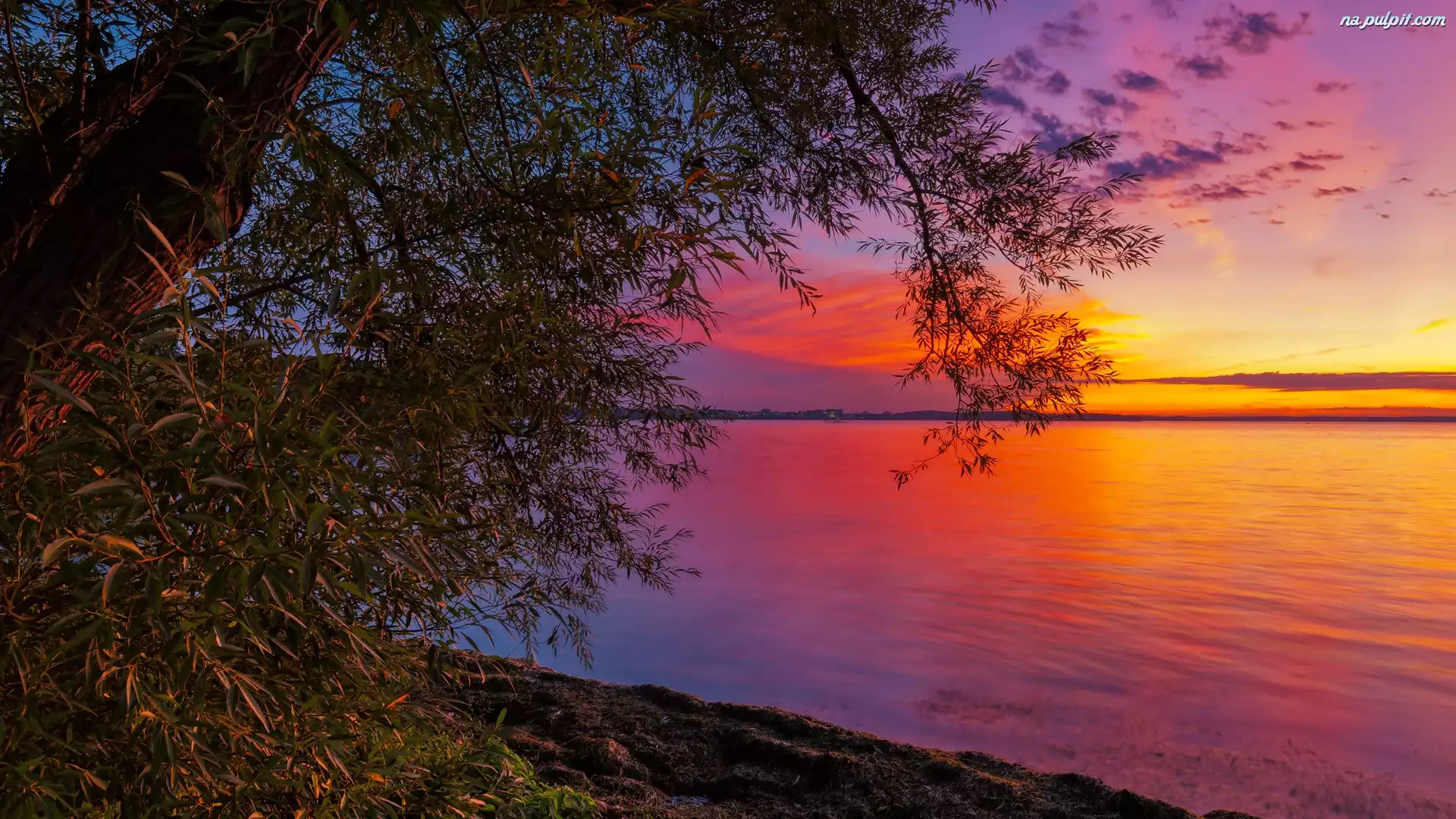 Drzewo, Jezioro, Brzeg, Zachód słońca Na Pulpit