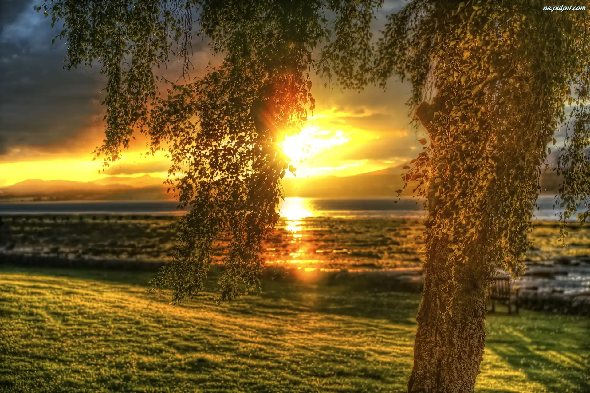 Drzewo, Słońca, Zachód, Łąka Na Pulpit