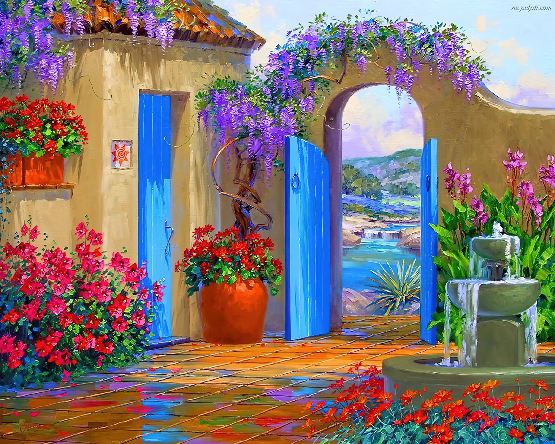 Drzwi, Fontanna, Patio, Dom, Niebieskie Na Pulpit