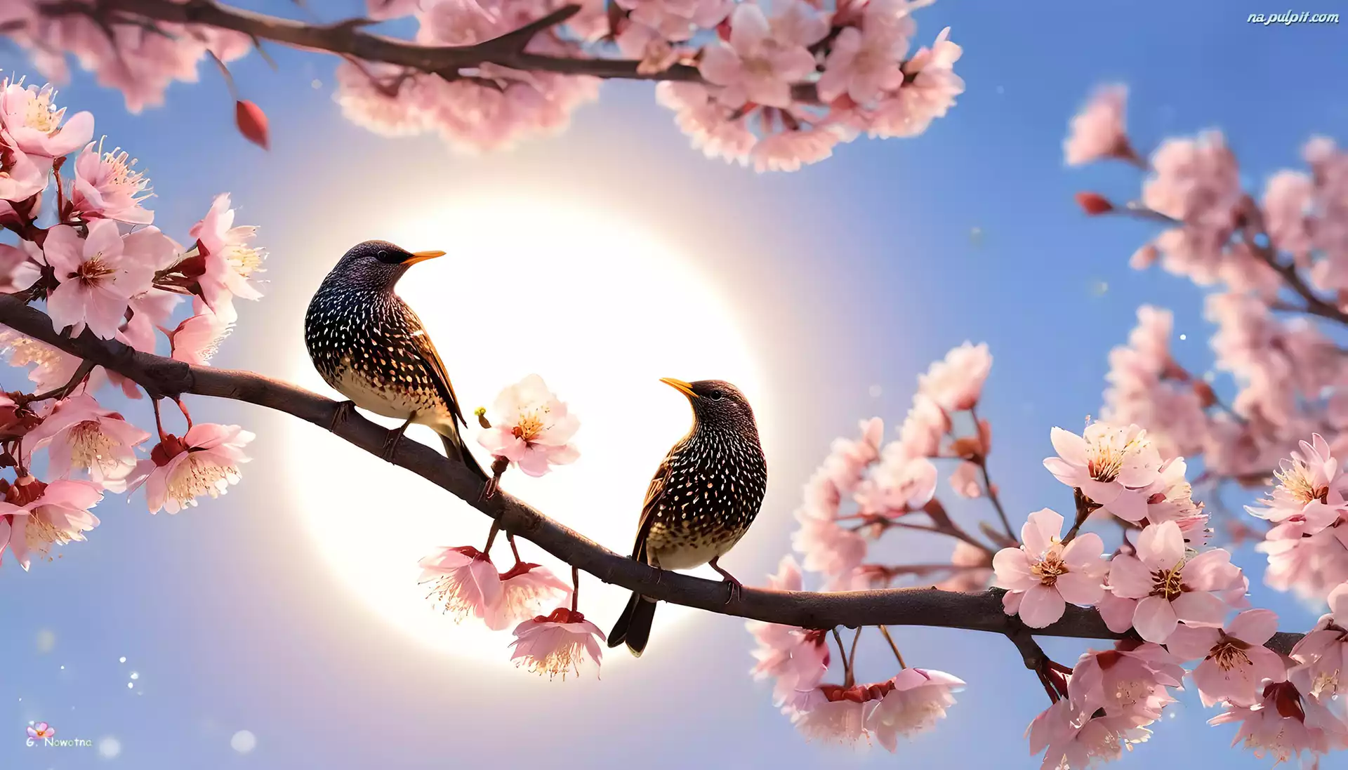 Grafika, Różowe, Gałązka, Dwa, Szpaki, Ptaki, Kwiaty Na Pulpit