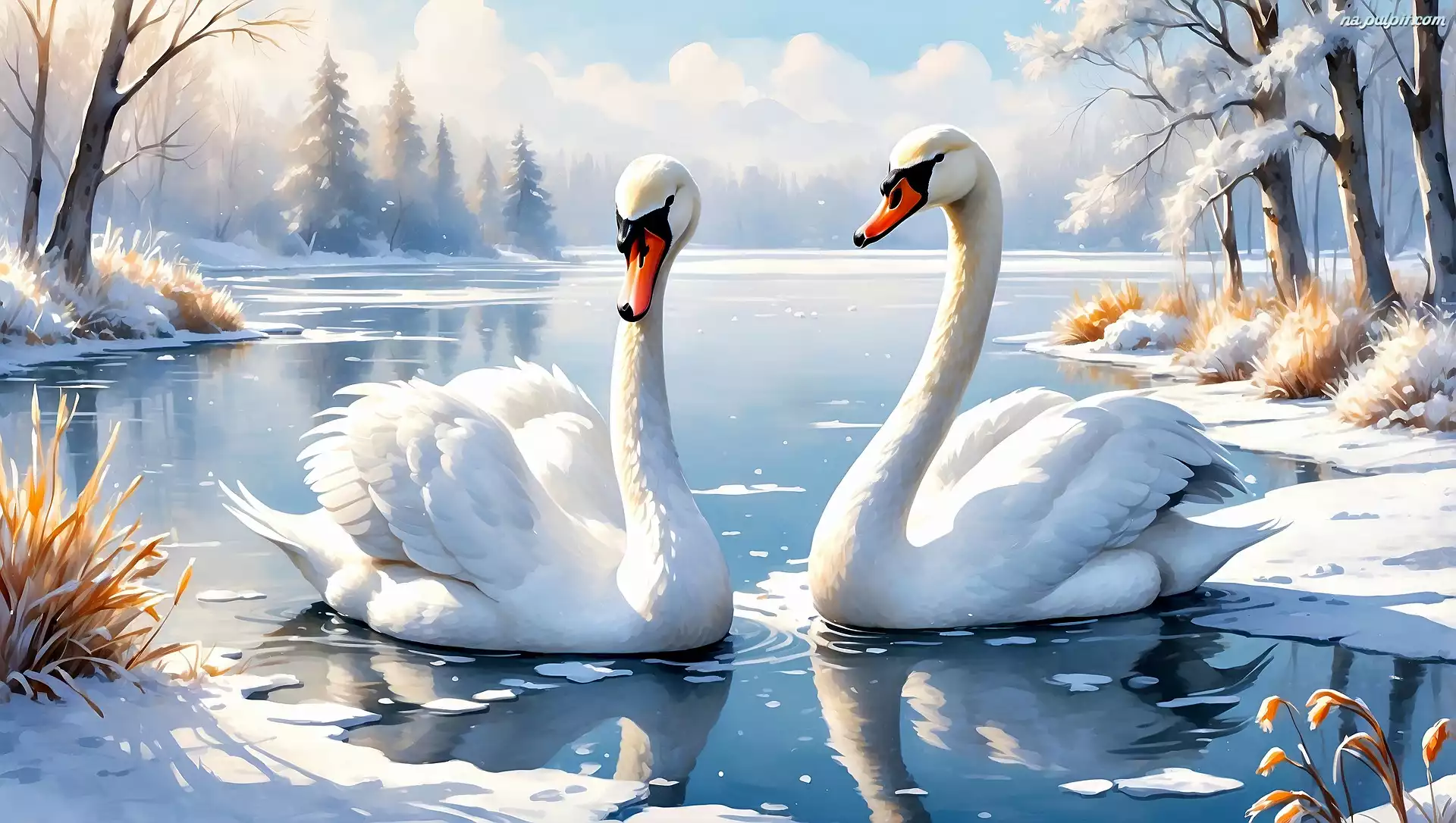 Zima, Dwa, Łabędzie, Grafika, Jezioro Na Pulpit