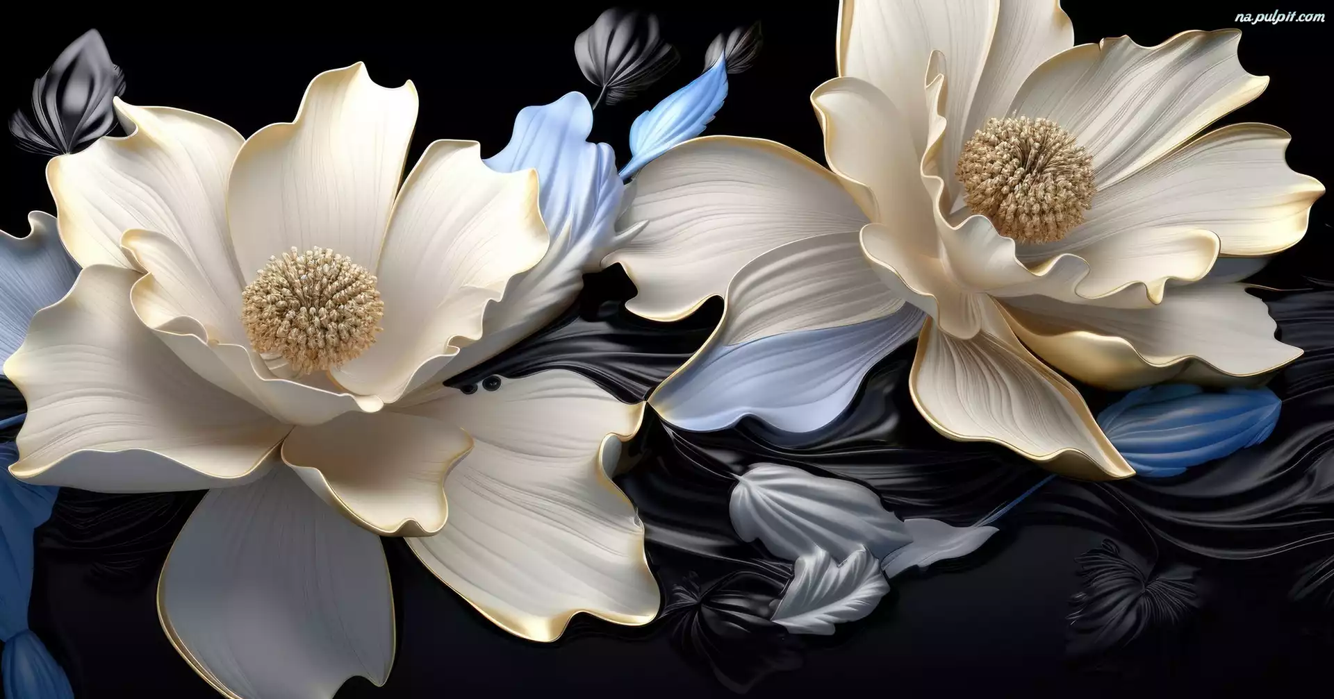 Grafika, Ciemne, Liście, Dwa, Białe, Kwiaty, Tło Na Pulpit