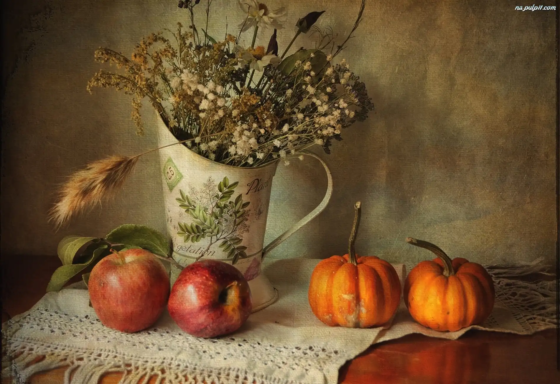 Dynie, Kwiaty, Suszone, Dzban, Jabłka