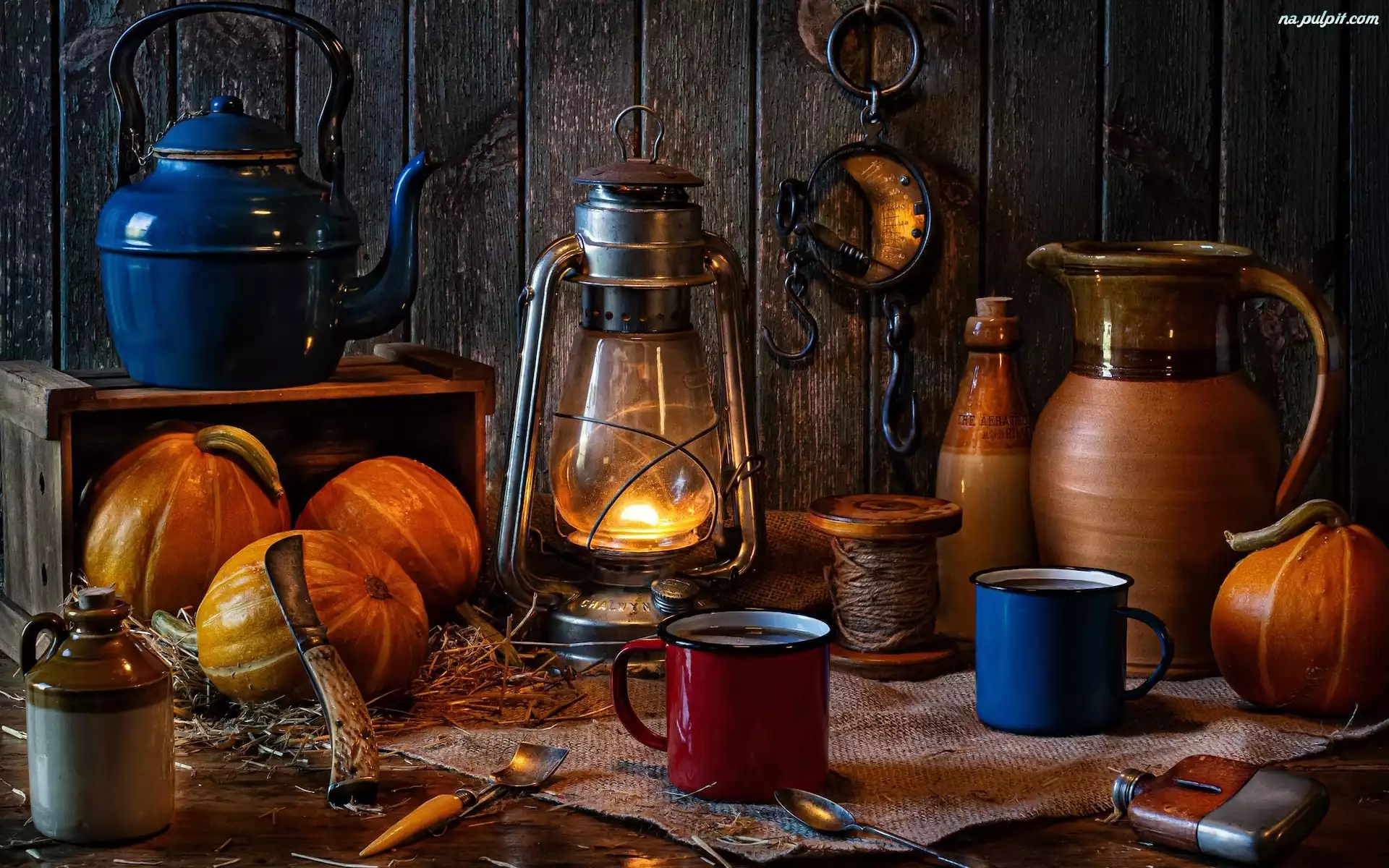 Dzbanek, Kompozycja, Czajnik, Dynie, Lampa, Kubki