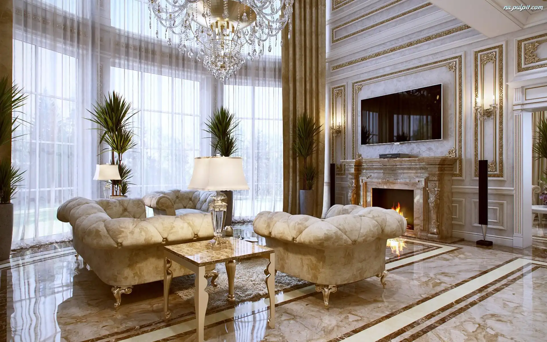 Pokój, Okna, Sofa, Kanapa, Kominek, Telewizor, Lampy, Żyrandol, Stylowy, Dywan Na Pulpit