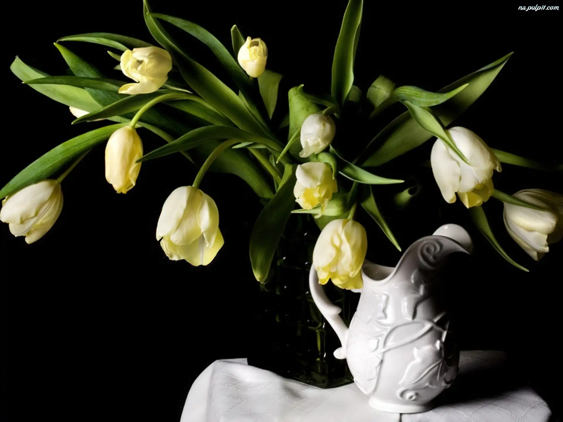 Dzbanek, Tulipanów, Białych, Bukiet, Biały Na Pulpit