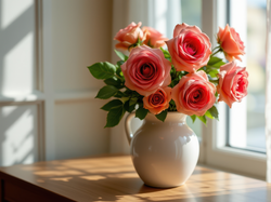 Stół, Kwiaty, Biały, Dzbanek, Róże, Okno