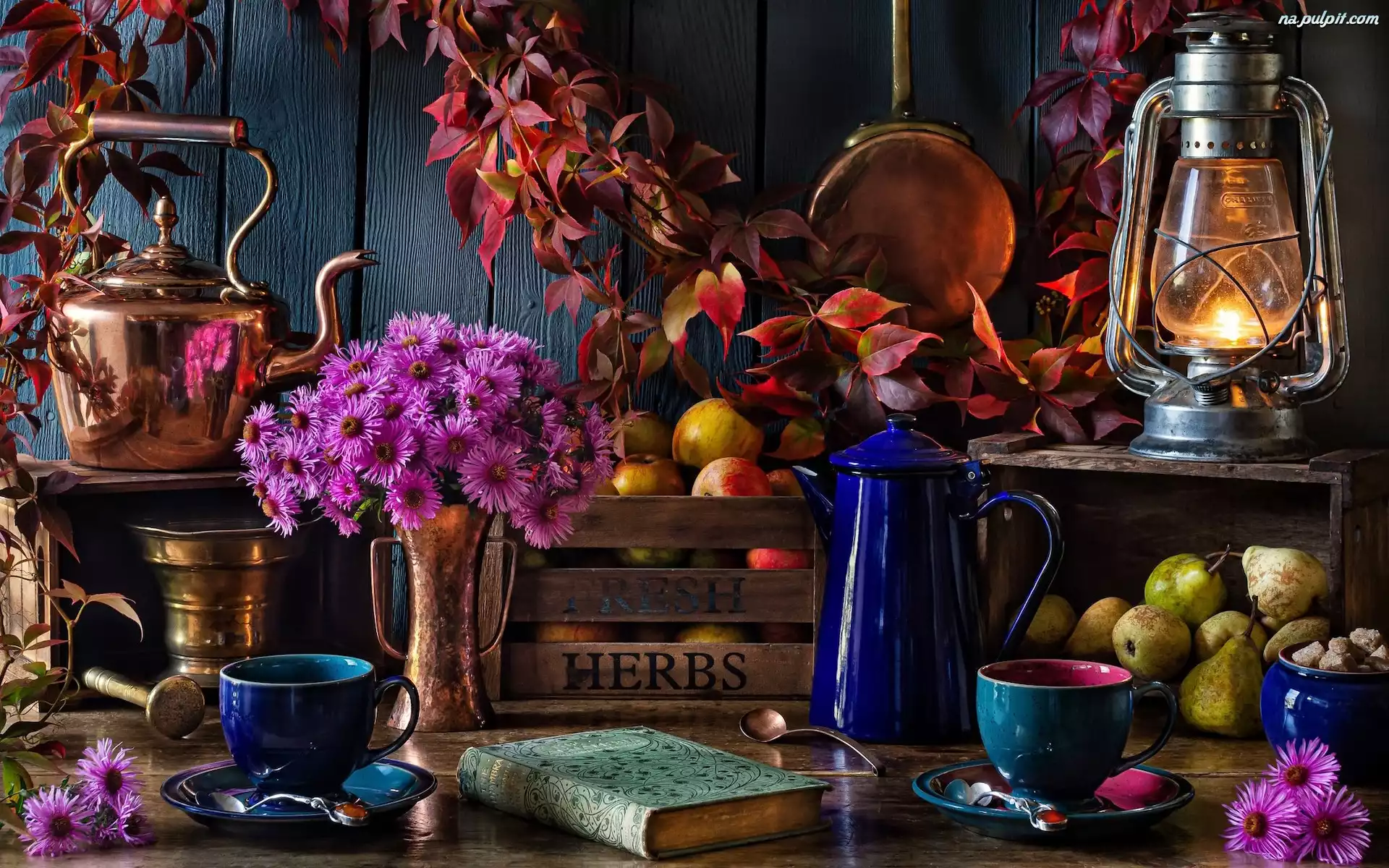 Dzbanek, Liście, Książka, Kwiaty, Lampa, Gruszki, Kompozycja, Czajnik, Patelnia, Jabłka Na Pulpit |