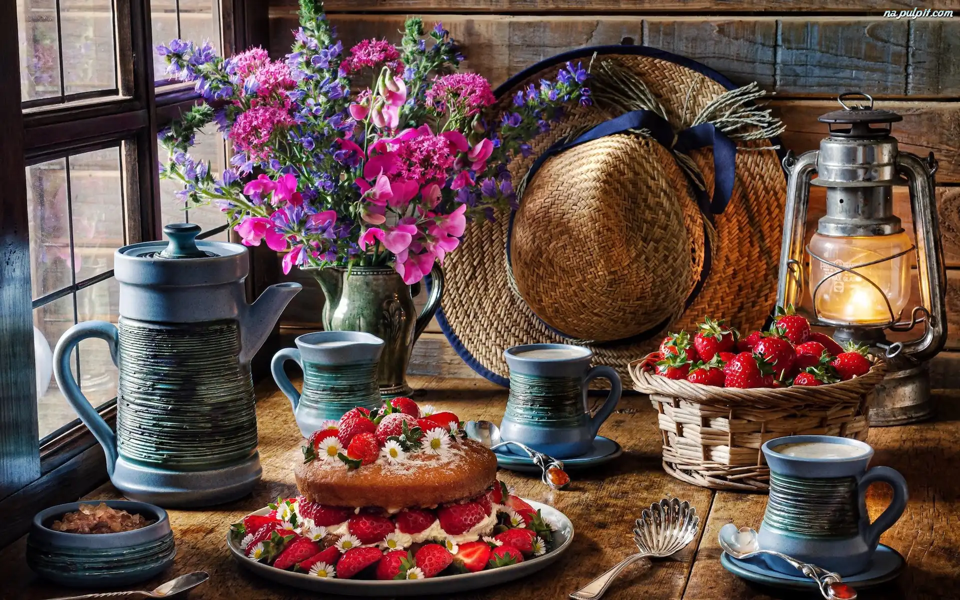 Dzbanek, Kubki, Okno, Kapelusz, Lampa, Bukiet kwiatów, Kompozycja, Truskawki, Ciasto Na Pulpit