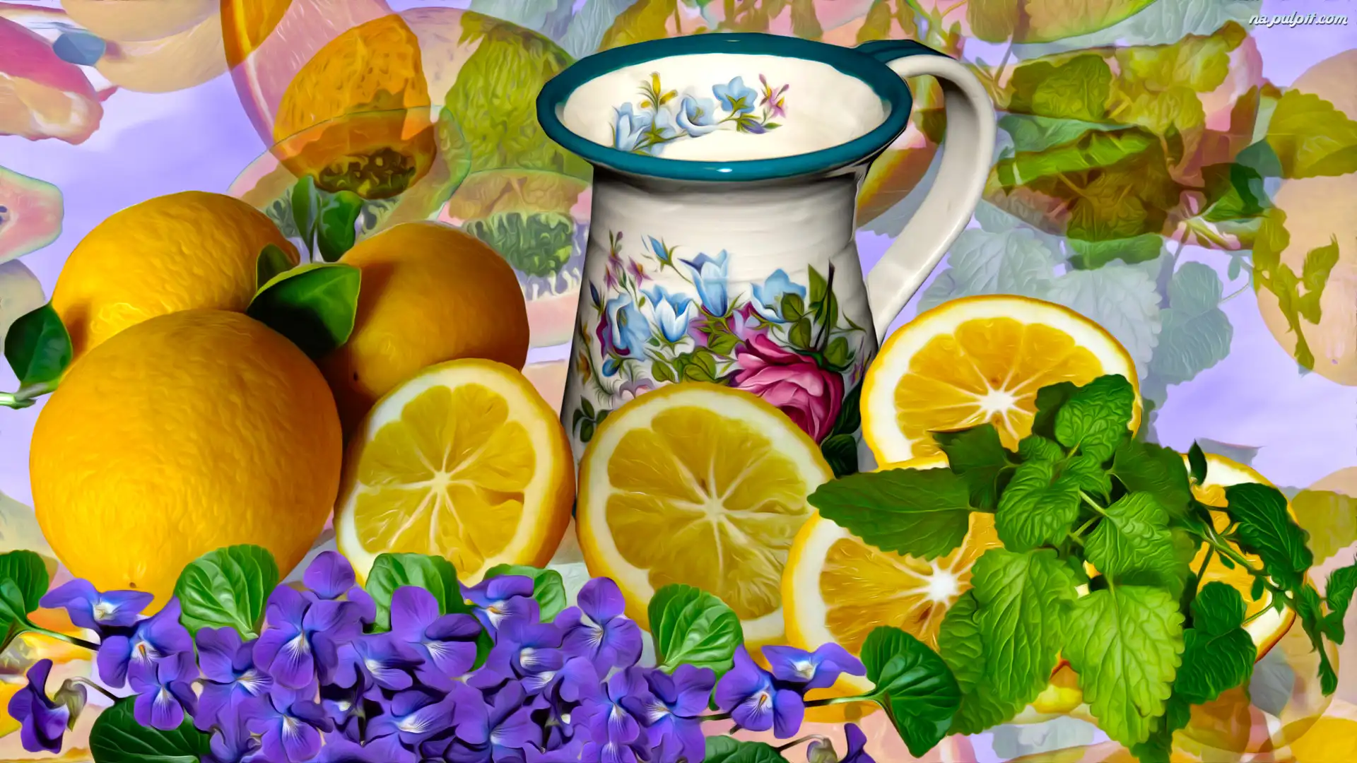 Dzbanuszek, Mięta, Cytryny, Grafika, Fiołki Na Pulpit
