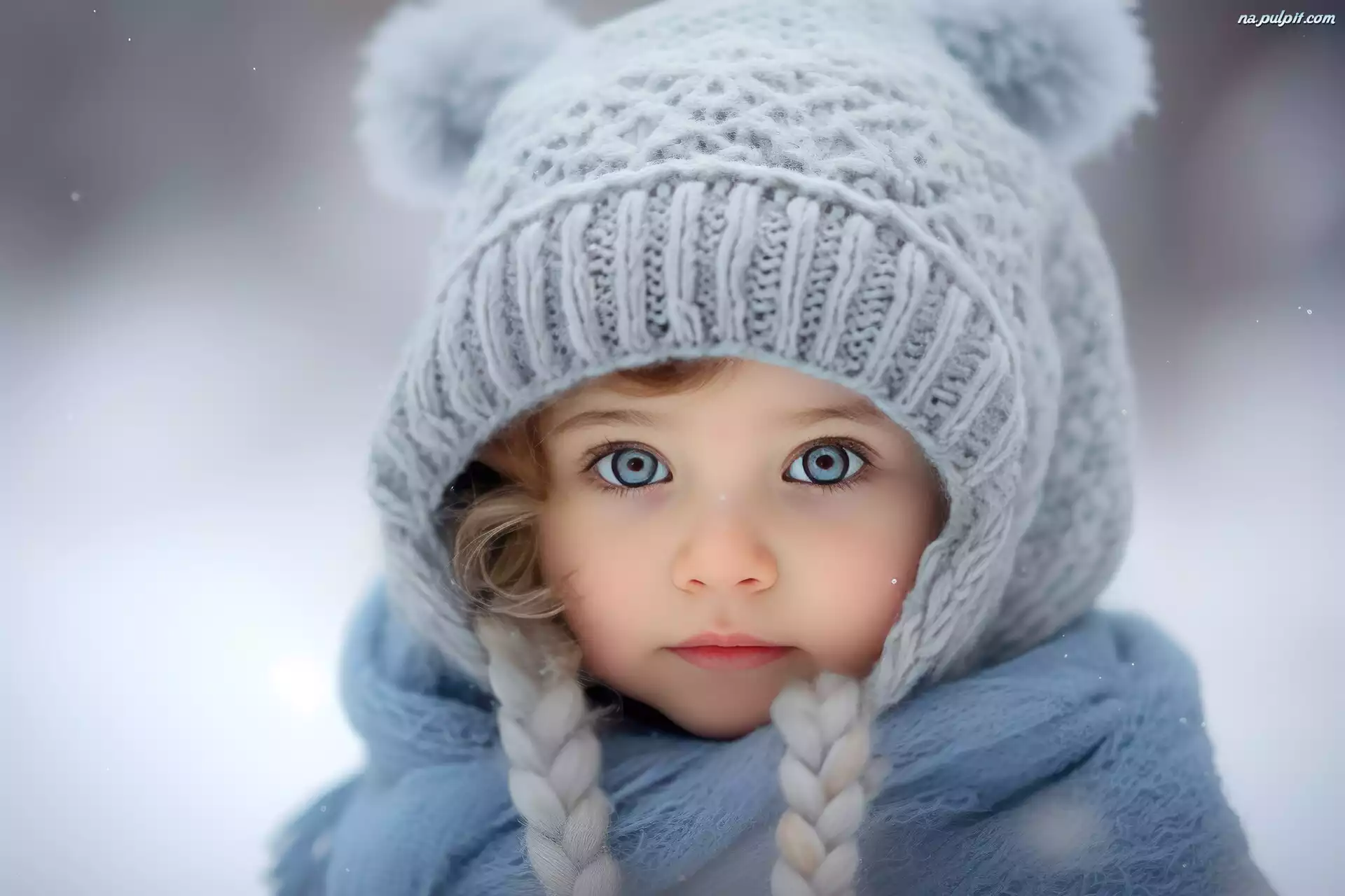 Warkocze, Szara, Oczy, Dziecko, Dziewczynka, Duże, Czapka
