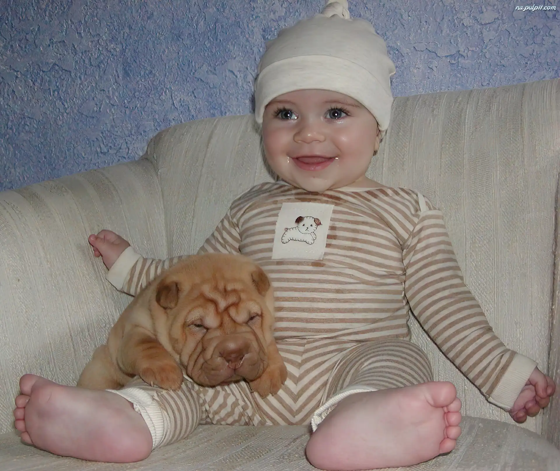 dziecko, Shar Pei, szczeniak, słodki, zadowolone