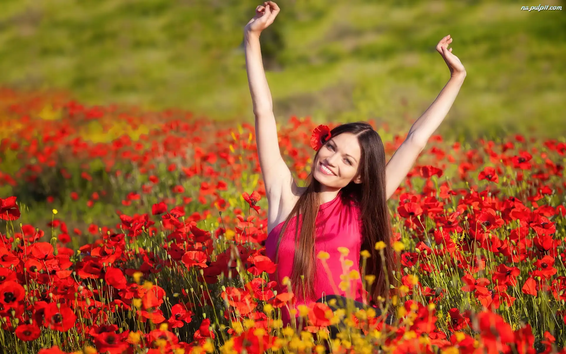 Dziewczyna, Maki, Łąka, Uśmiechnięta