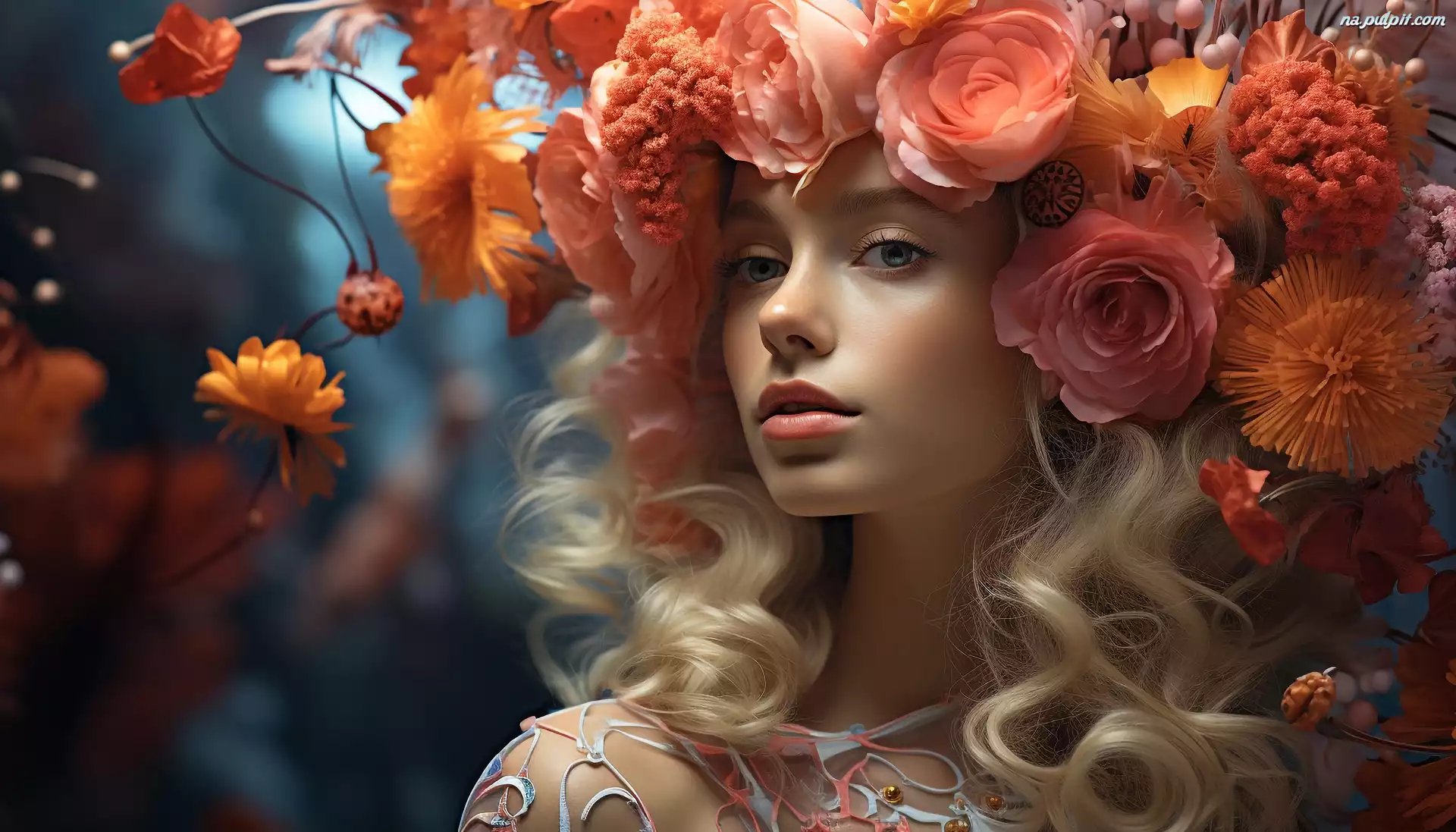 Kwiaty, Dziewczyna, Blondynka, Grafika, Pomarańczowe Na Pulpit