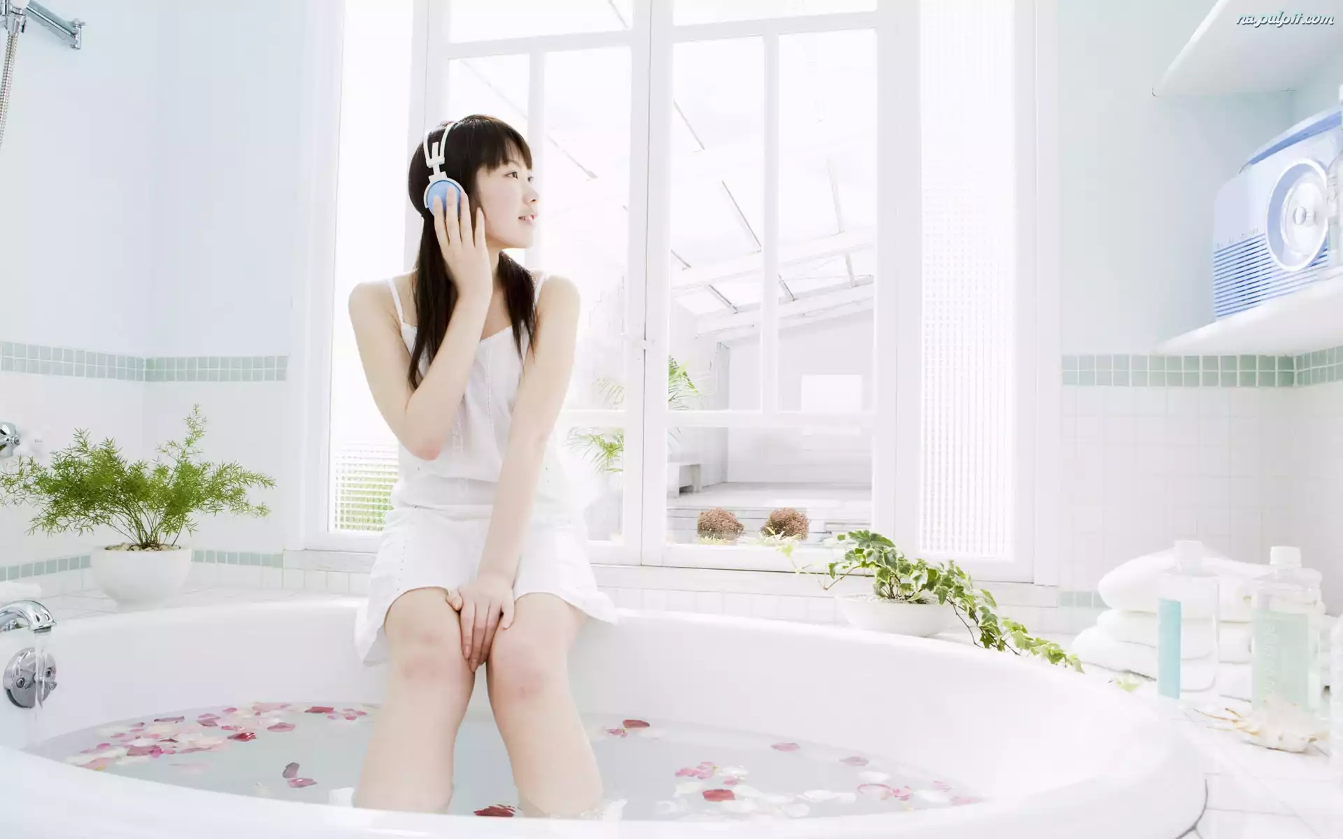 Dziewczyna, Łazienka, Woda, Azjatka, Brunetka, Słuchawki