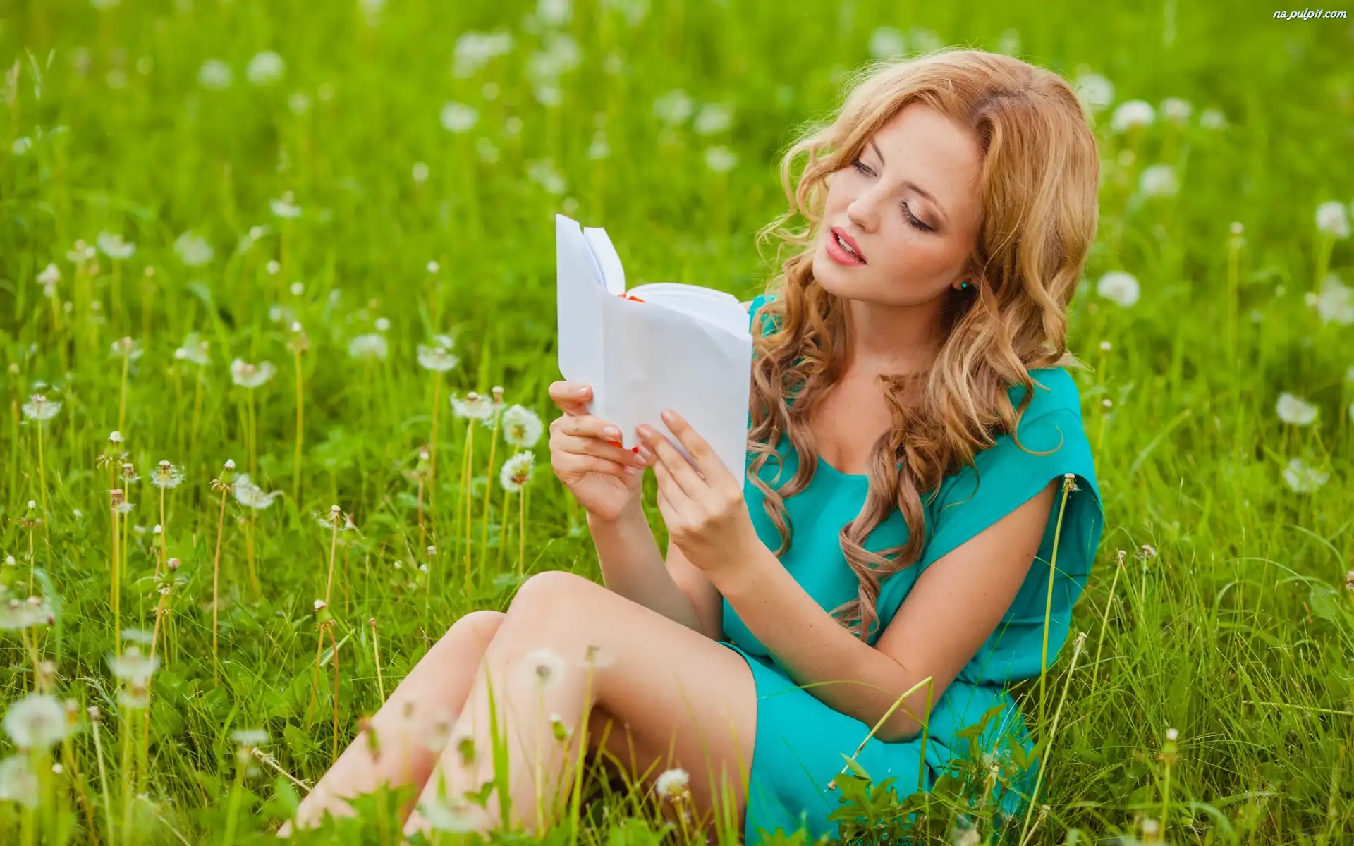 Dziewczyna, Trawa, Wiosna, Łąka, Czytająca, Mlecze