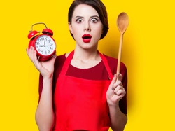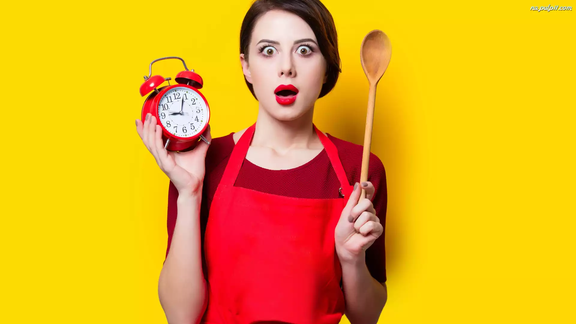 Budzik, Łyżka, Drewniana, Dziewczyna, Czerwony, Fartuch, Zegar