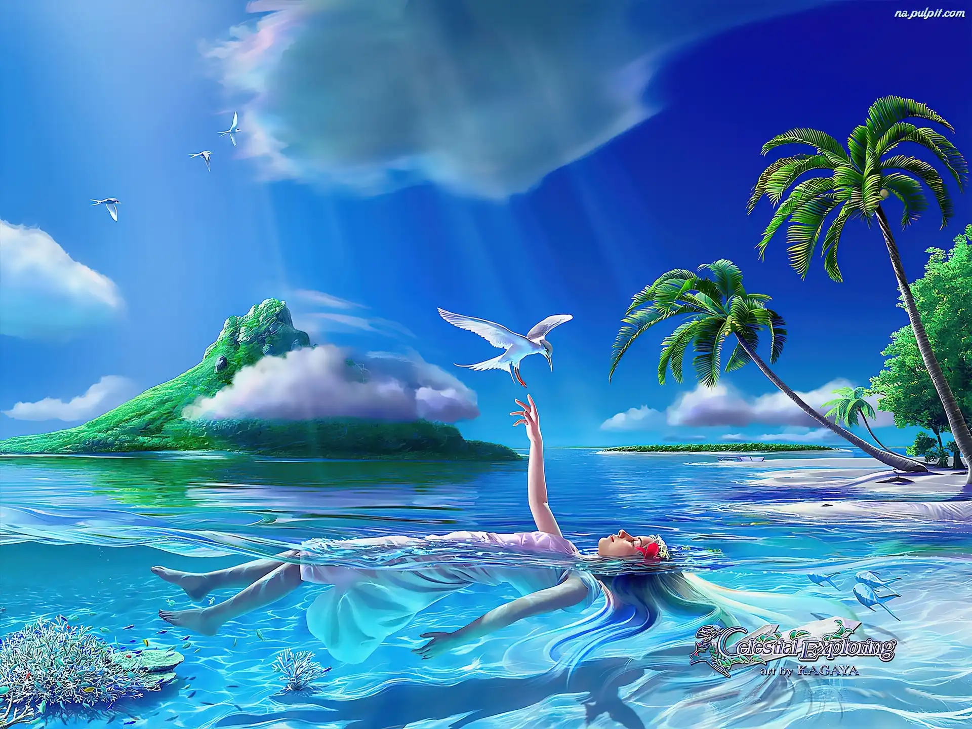 Palmy, Grafika, Woda, Mewa, Dziewczyna, Kagaya Na Pulpit