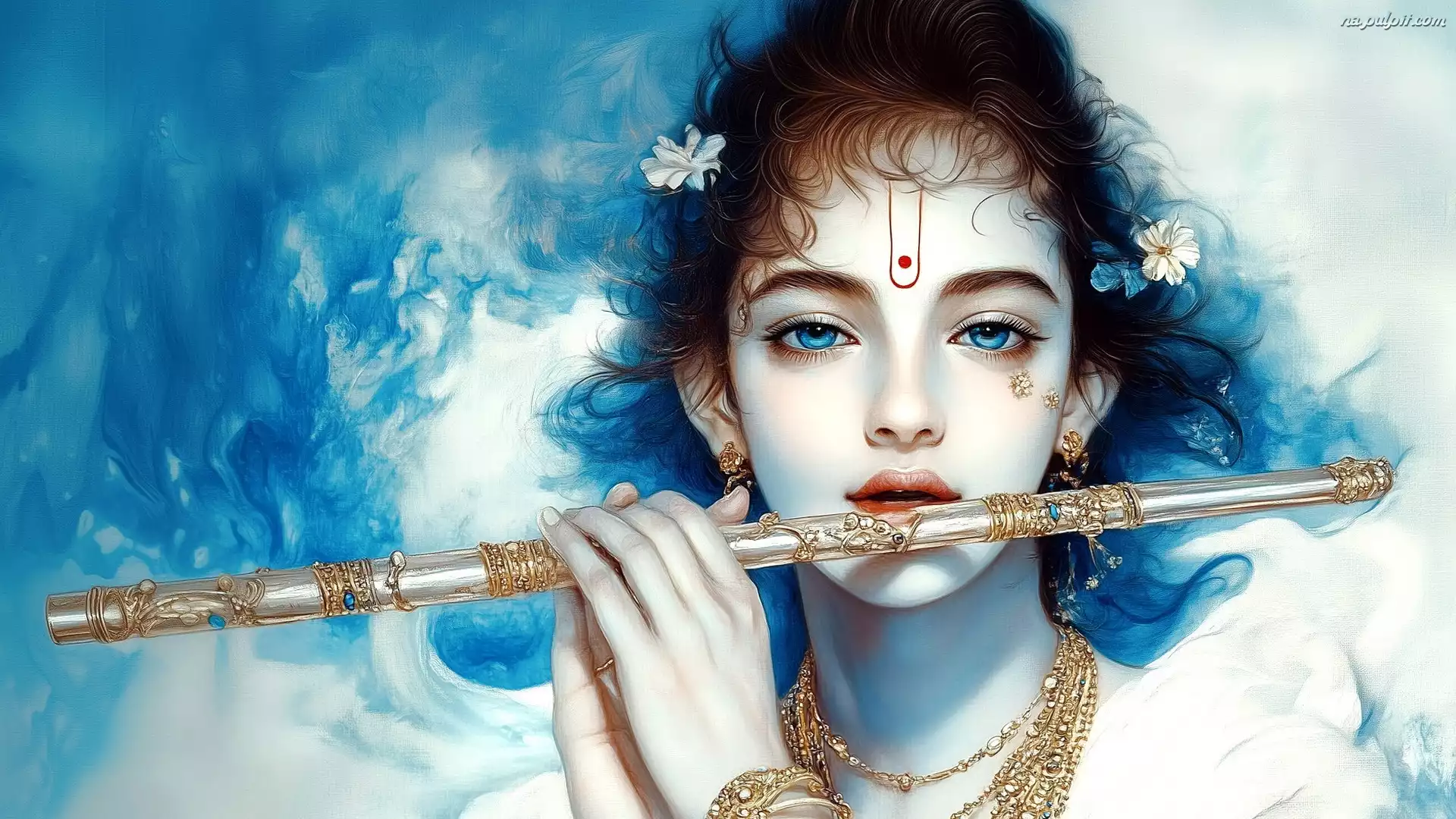 Grafika, Biżuteria, Makijaż, Dziewczyna, Niebieskie, Oczy, Flet